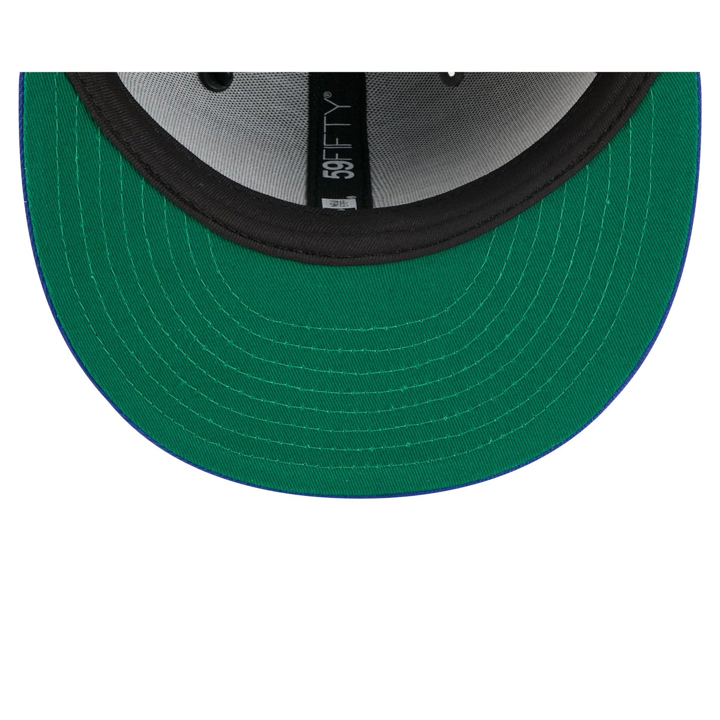 The Los Angeles Rams Heather Gray Wool 59FIFTY Fitted Cap features an embroidered Rams Historic logo and conference pin at the front panels against a wool fabrication throughout. Additional details include a helmet graphic at the right-wear side, an NFL Shield logo at the rear, and a green undervisor.