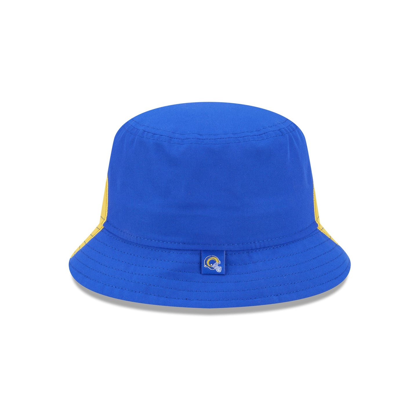 The Los Angeles Rams Helmet Bucket Hat features an embroidered Rams helmet design throughout.