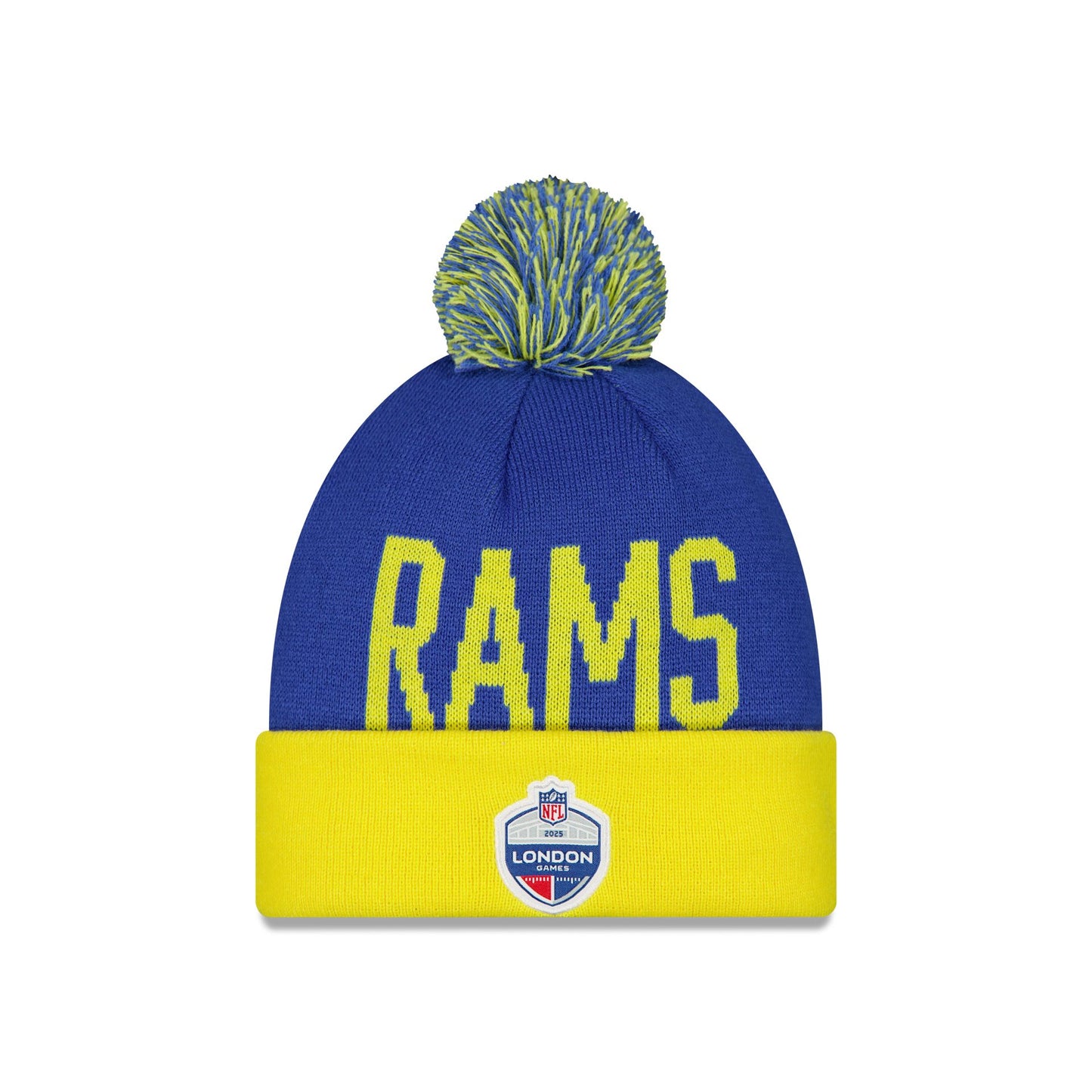 The Los Angeles Rams London Game Pom Knit features an embroidered Rams logo at the front cuff with a London Game patch at the rear and a one-time removable pom.