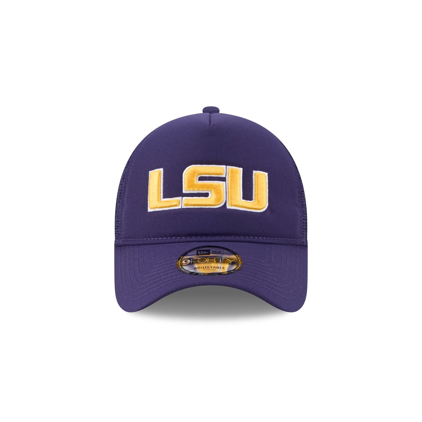 The LSU Tigers Go-To 9FORTY A-Frame Trucker features an embroidered Tigers logo at the front panels with a snapback closure at a mesh rear.