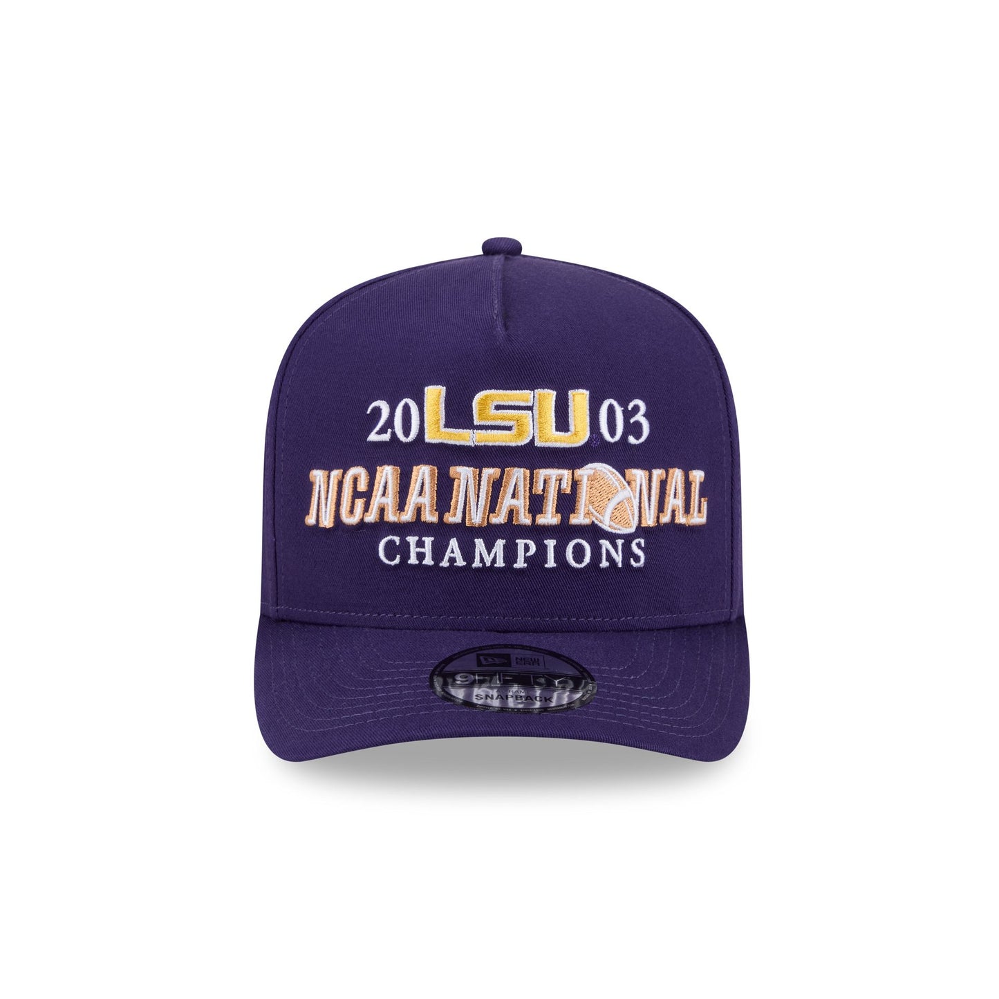 The LSU Tigers Historic Win 9FIFTY A-Frame Snapback features an embroidered Tigers graphic highlighting a historic victory at the front panels and a team logo at the right-wear side. Additional details include an adjustable snapback closure at the rear and a green undervisor.