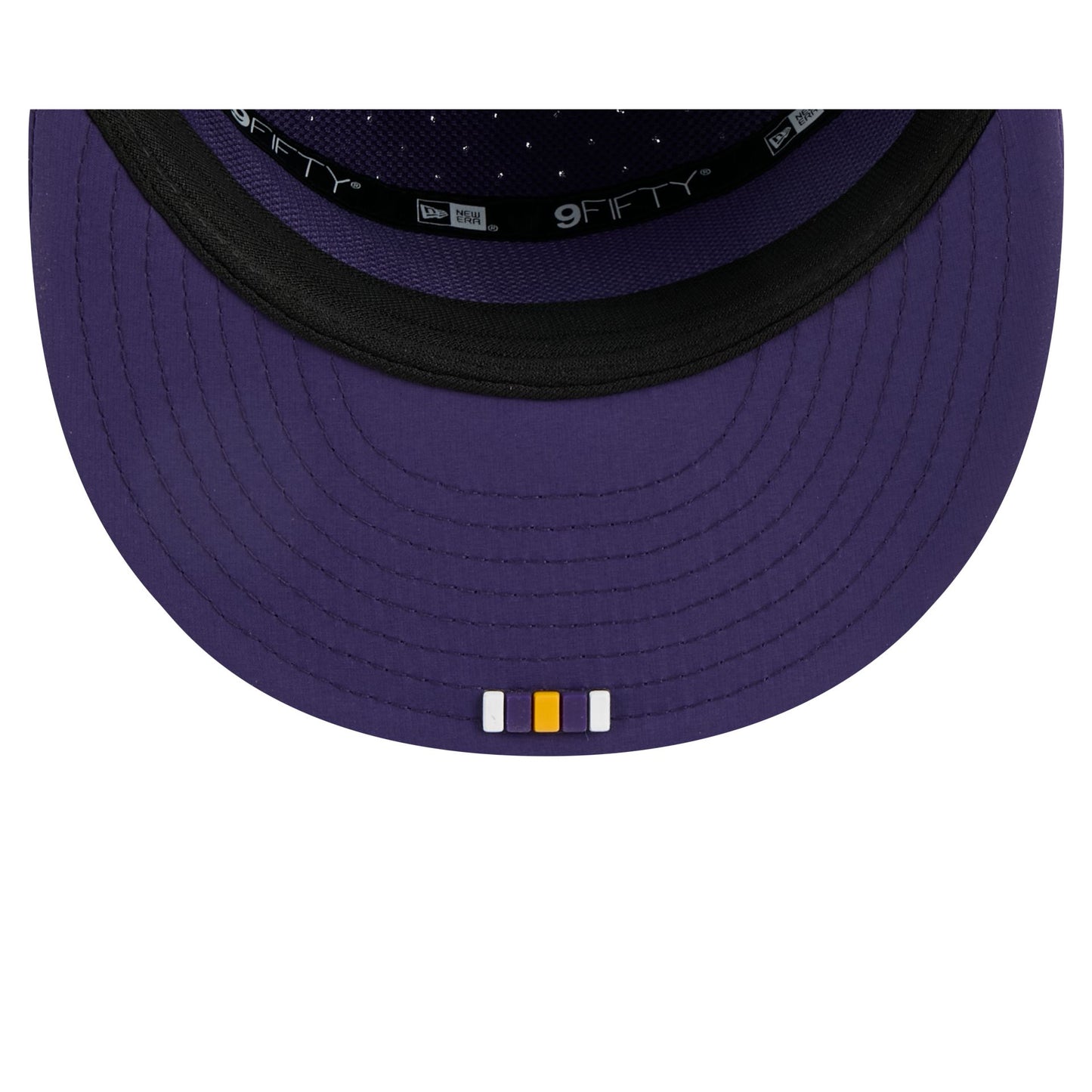 The LSU Tigers Hot Weather Split Panel 9FIFTY Snapback features a sewn-down silicone Tigers logo patch at the front panels with a split-crown construction featuring water-repellent quill tech fabrication. Additional details include a team wordmark at a soft silicone snapback closure at the rear with a quick-dry cushioned sweatband to absorb moisture and team color silicone transfer details at the undervisor.