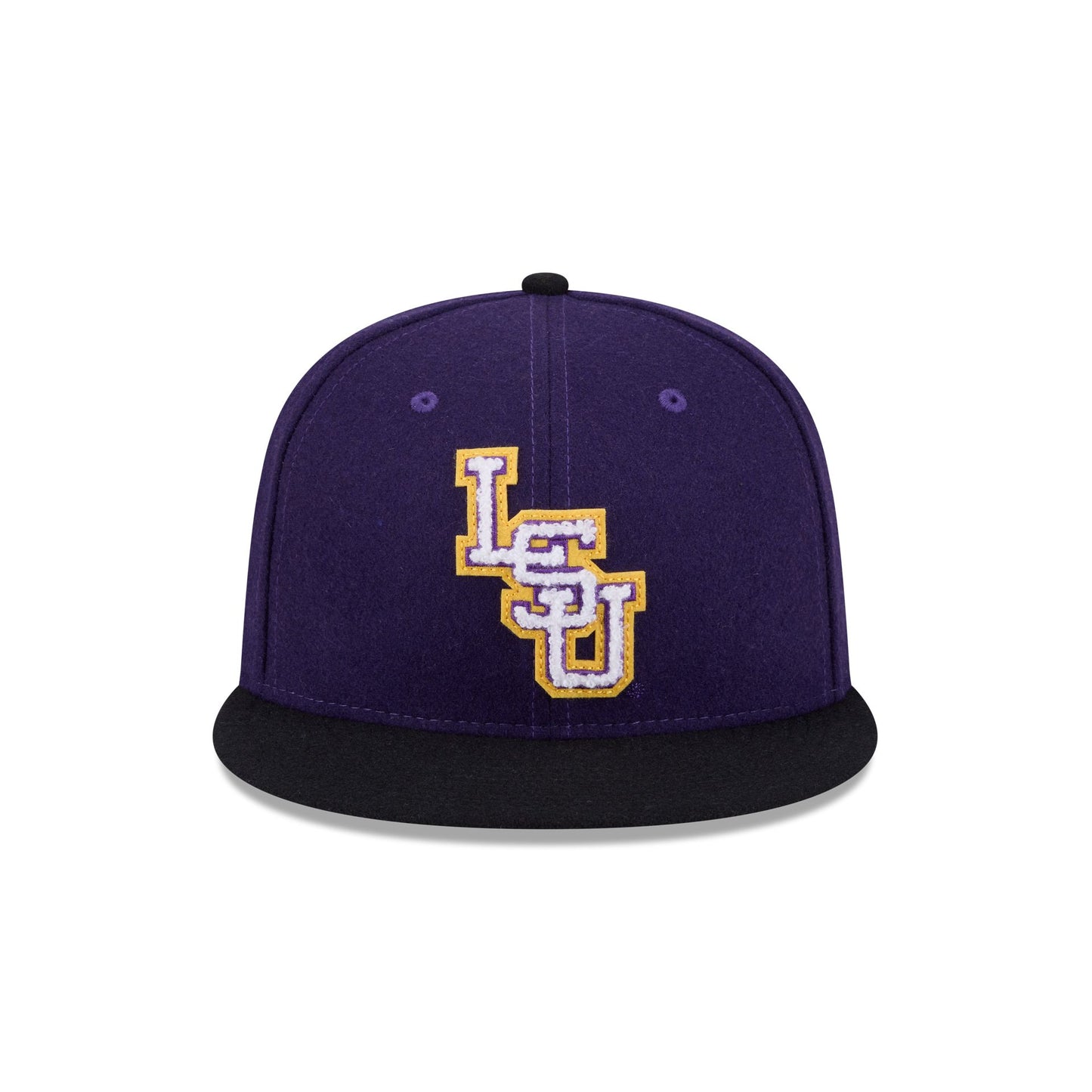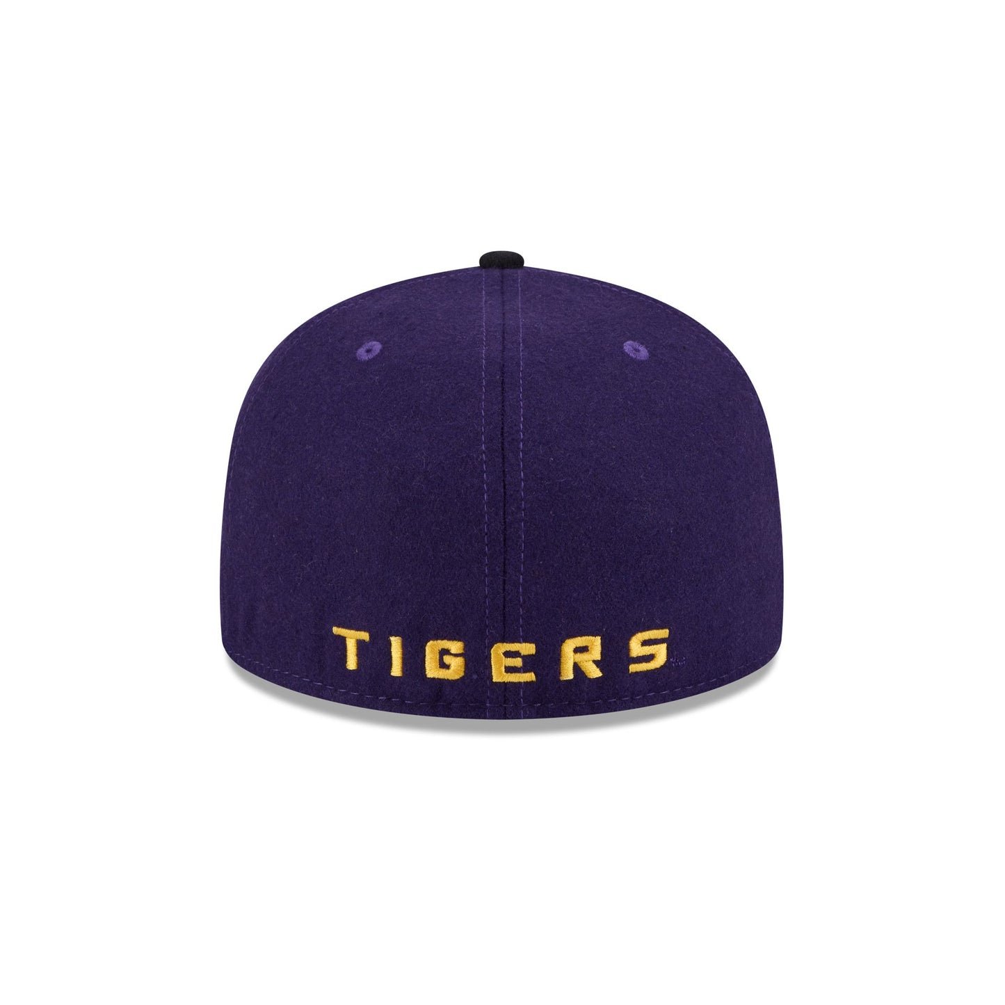 The LSU Tigers Melton Wool 59FIFTY Fitted Cap features a chenille applique Tigers logo patch at the front panels with an embroidered team wordmark at the rear and a gray undervisor.