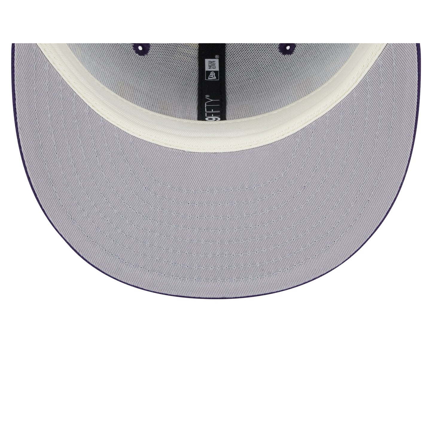 The LSU Tigers Plaid 9FIFTY Snapback features an embroidered Tigers logo at the front panels against a matching plaid pattern. Additional details include a team logo above a snapback closure at the rear and a gray undervisor.