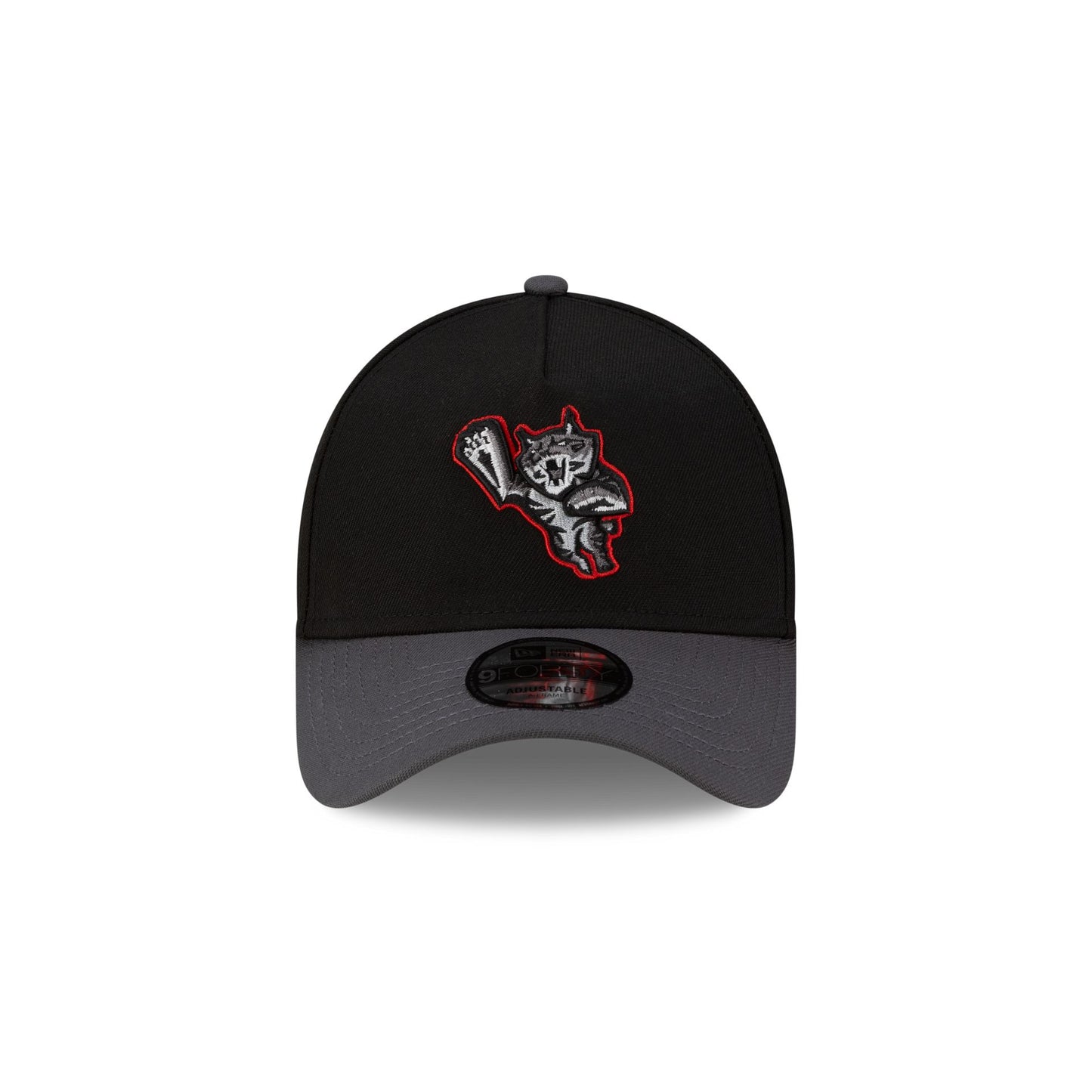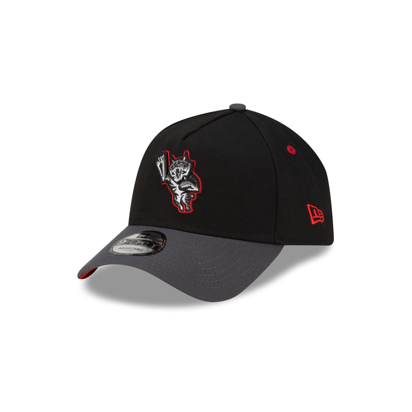 The Lynchburg Hillcats Halloween Red 9FORTY A-Frame Snapback features an embroidered Hillcats themed logo at the front panels with an adjustable snapback closure at the rear, a gray visor, and a red undervisor.