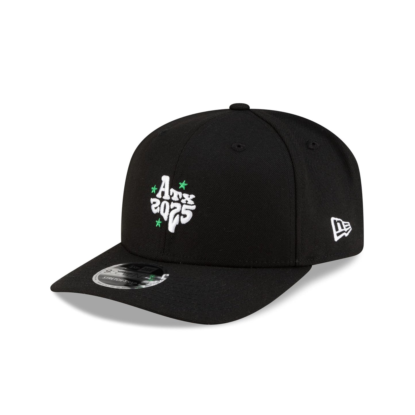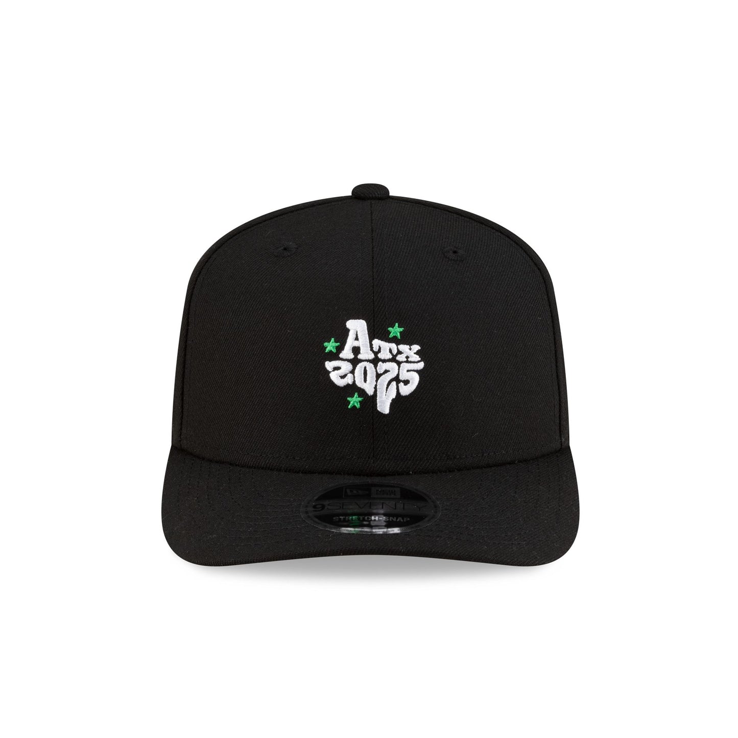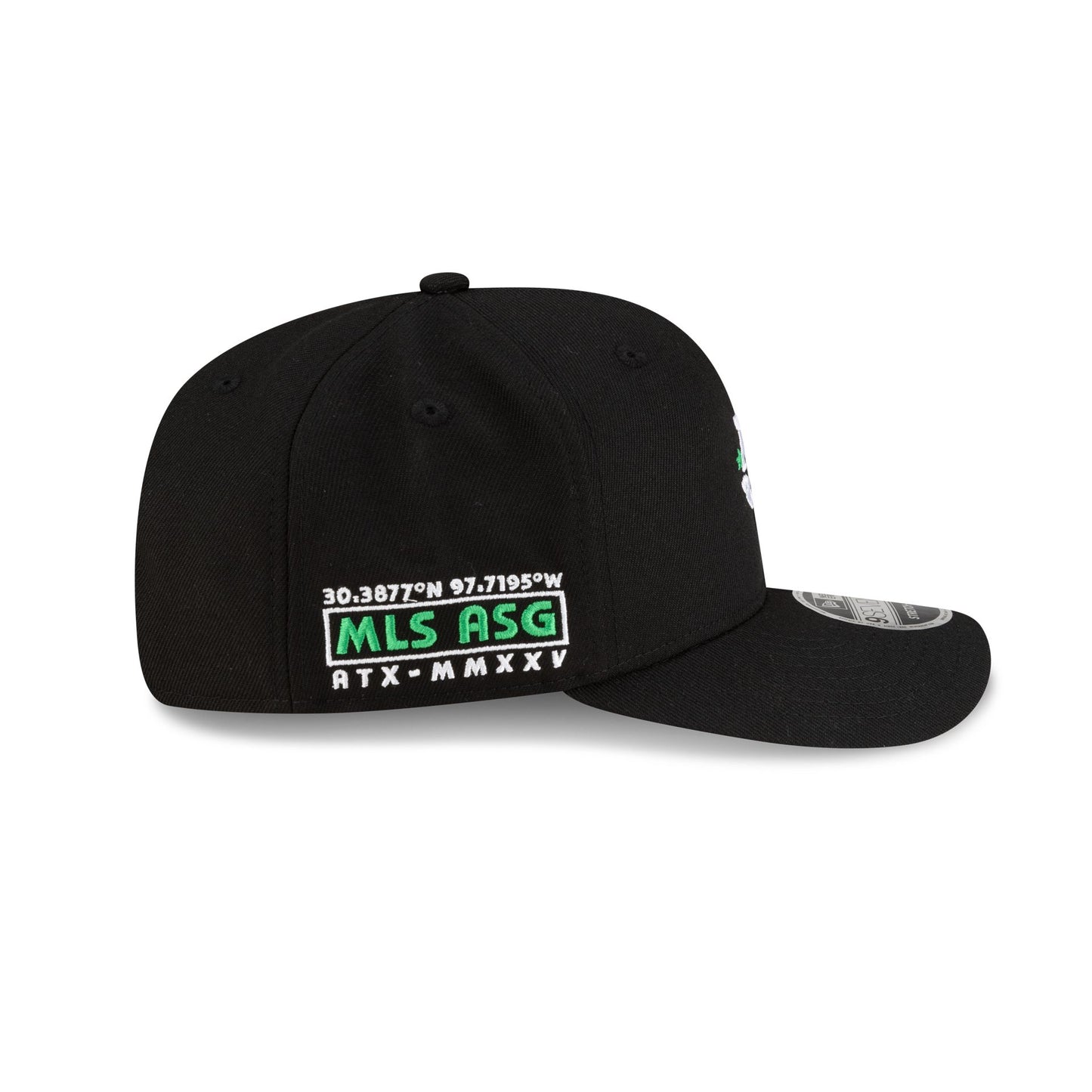 The Major League Soccer 2025 All-Star Game 9SEVENTY Stretch-Snap Cap features an embroidered MLS 2025 All-Star Game Austin, Texas logo at the front panels with a matching MLS Shield above a snapback closure at the rear. Additional details include an alternate MLS 2025 All-Star Game patch with Austin FC Q2 Stadium coordinates at the right-wear side and a gray undervisor.