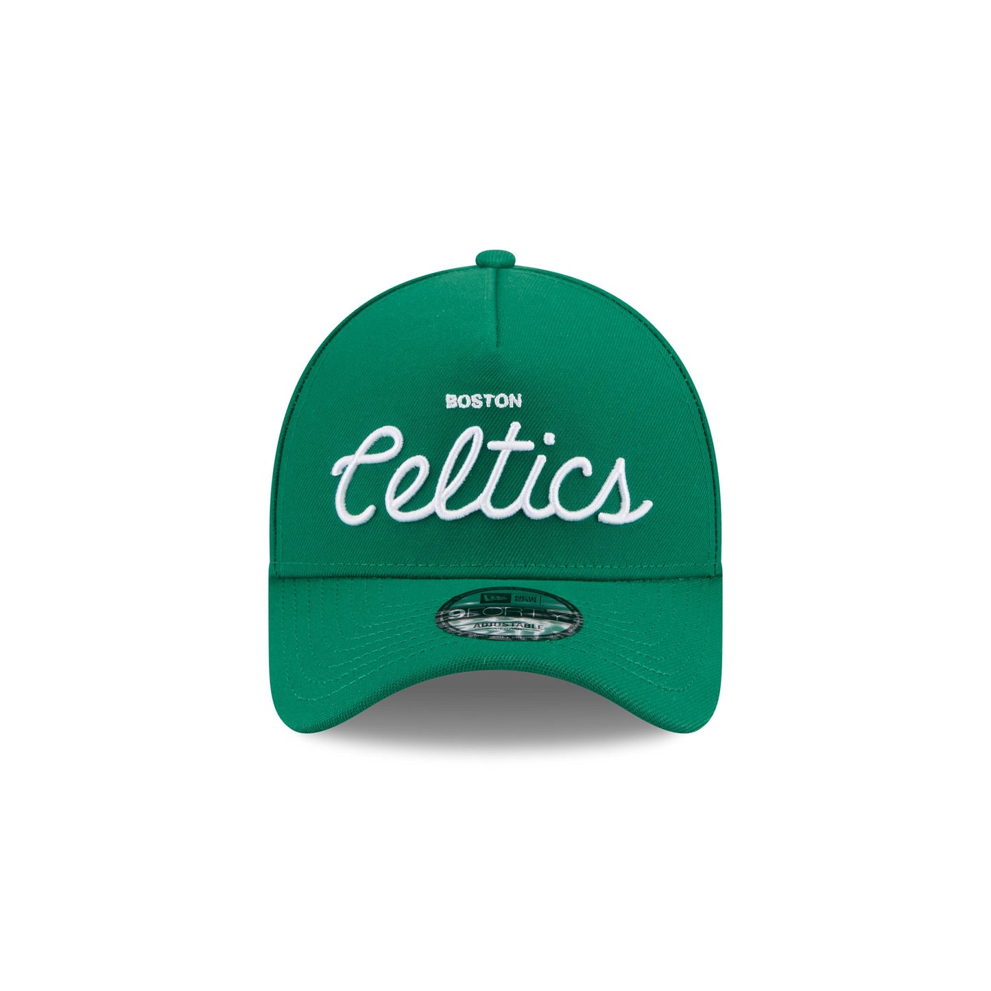 The Malbon Golf x Boston Celtics 9FORTY A-Frame Snapback features an embroidered Celtics script wordmark at the front panels with a team logo at the right-wear side. Additional details include a Malbon wordmark above an adjustable snapback closure at the rear.