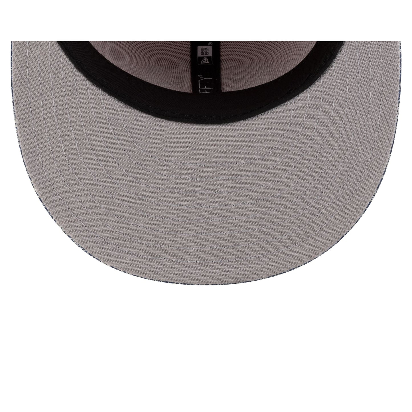 The Manchester United FC Red Denim 59FIFTY Fitted Cap features an embroidered Manchester United logo at the front panels of a red crown and a patterned denim visor. Additional details include a team wordmark at the rear and a gray undervisor.