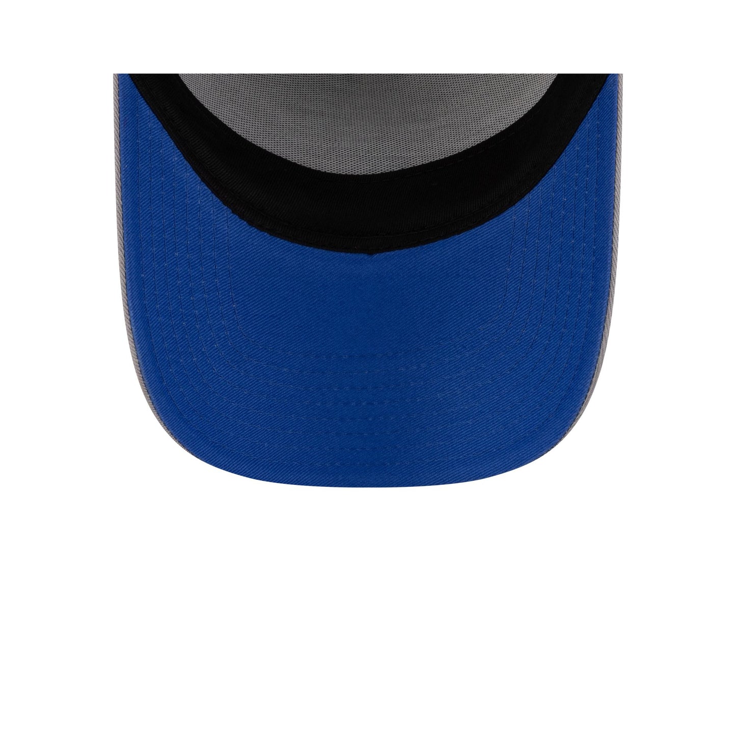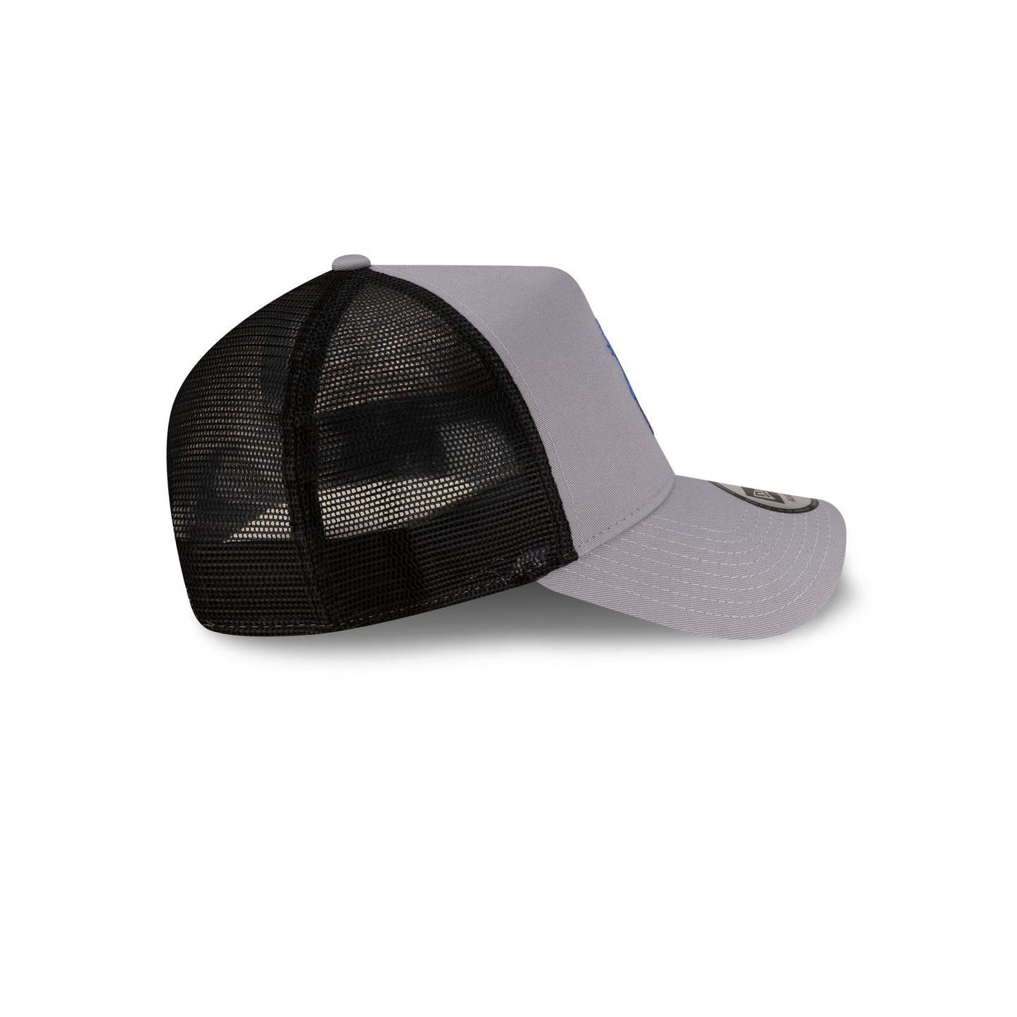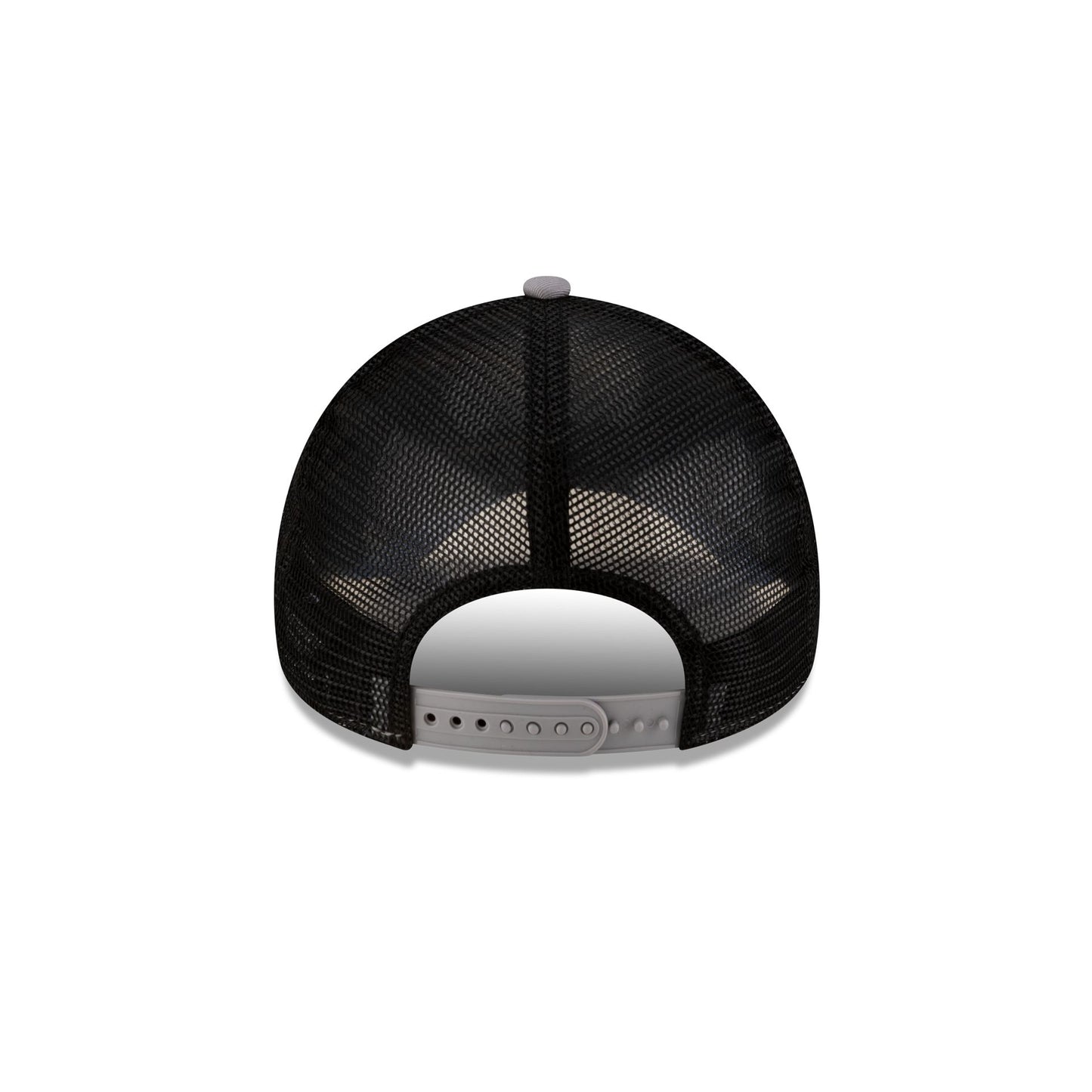 The Manchester United FC Seasonal Graphite 9FORTY A-Frame Trucker features an embroidered Manchester United logo at the front panel with an adjustable snapback closure at the rear and a blue undervisor.