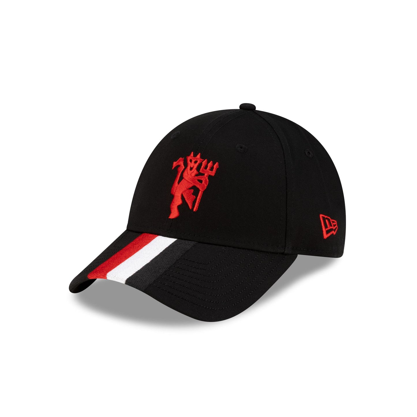 The Manchester United FC Stripe Black 9FORTY Adjustable Cap features an embroidered Manchester United logo at the front panels with red, white and black stripes at the visor, a black undervisor, and an adjustable D-Ring closure at the rear.
