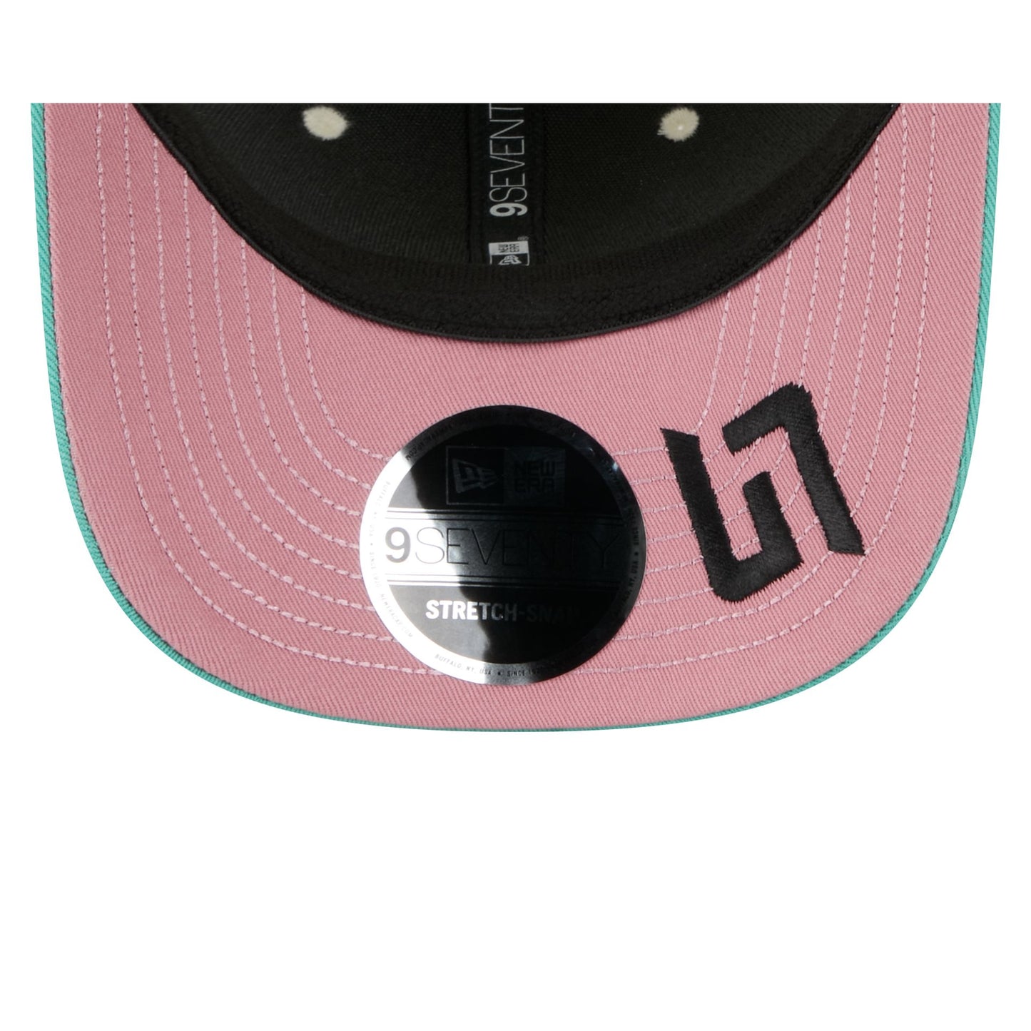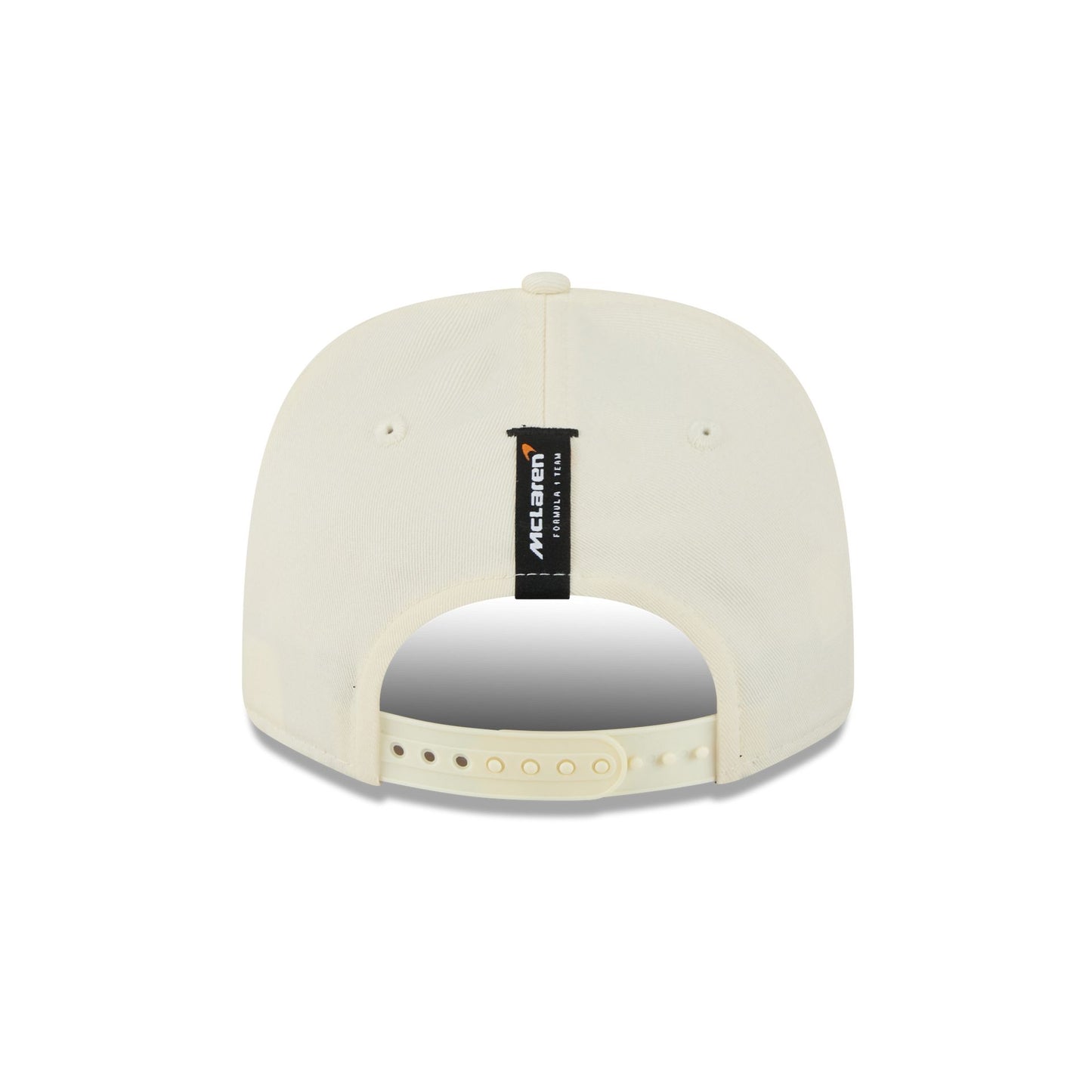 The McLaren Formula 1 Team 2025 Sao Paulo Race Special Lando Norris 9SEVENTY Stretch-Snap features an embroidered McLaren Racing logo at the front panels with a Mastercard logo at the right-wear side and the driver's number at the visor. Additional details include flowers at the visor, a McLaren tag logo above an adjustable stretch-snap closure at the rear, and initials at a pink undervisor.