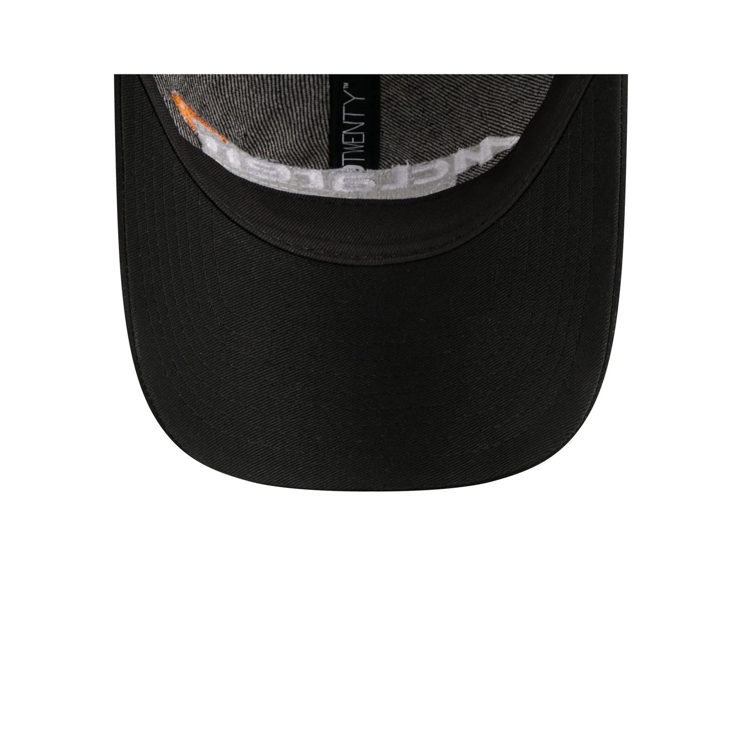 The McLaren Formula 1 Team Black Denim 9TWENTY Adjustable Cap features an embroidered McLaren Racing wordmark at the front panels with an orange checkered print adjustable D-Ring closure at the rear and a black undervisor.