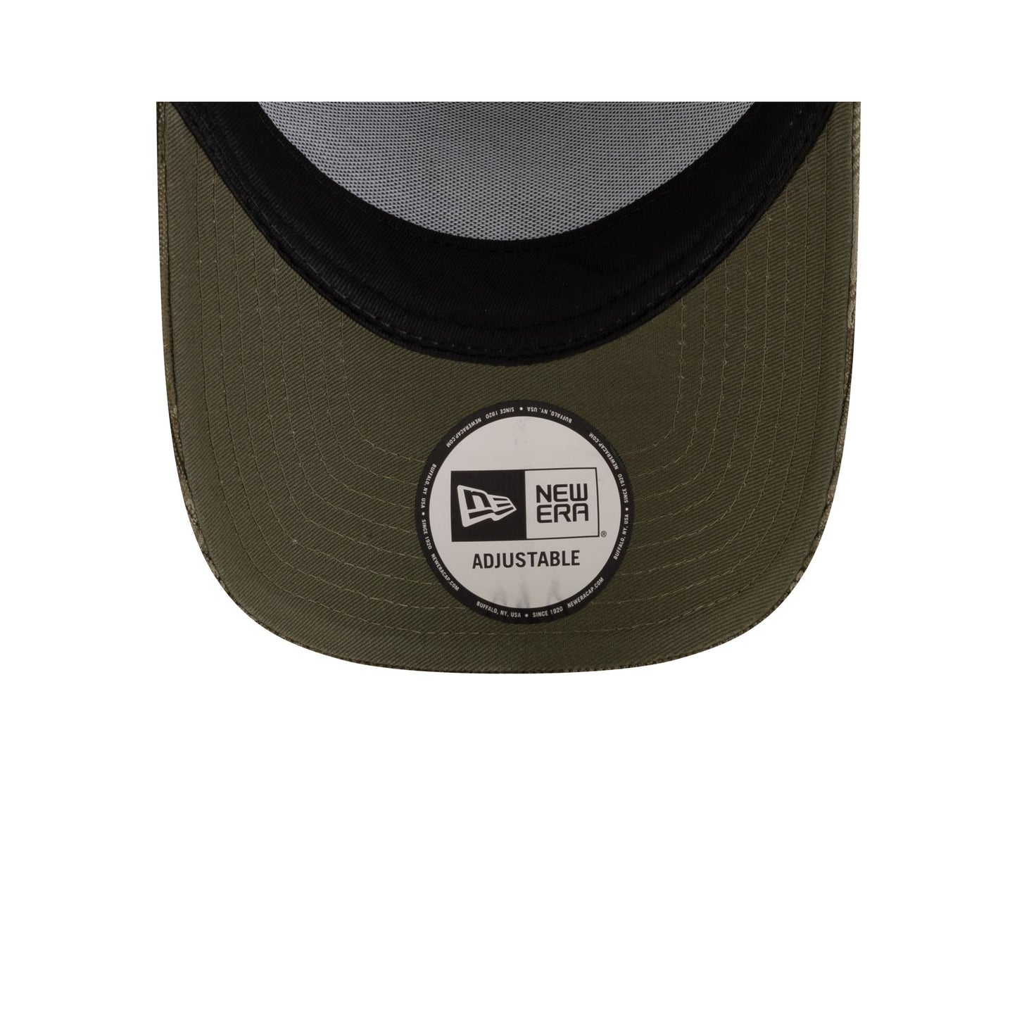 The McLaren Formula 1 Team Camo Cord 9FORTY A-Frame Trucker features an embroidered McLaren logo at the front panels against a camo corduroy fabrication. Additional details include a snapback closure at a mesh rear and a green undervisor.
