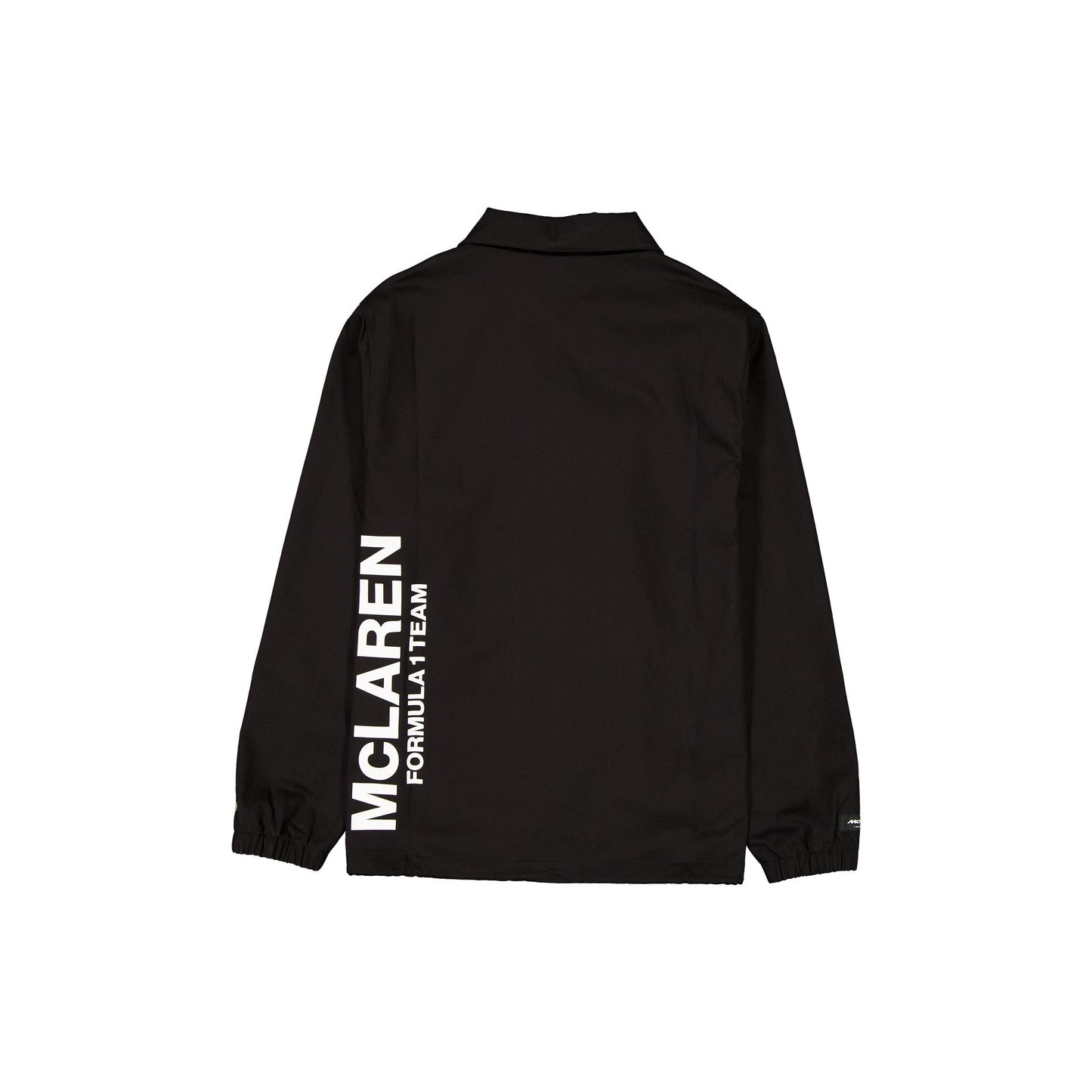 The McLaren Formula 1 Team Coach's Jacket features an embroidered McLaren logo at the left chest with pockets and a button closure. Additional details include a screen-printed wordmark at the rear, adjustable drawstrings, and a woven tag at the right wrist.