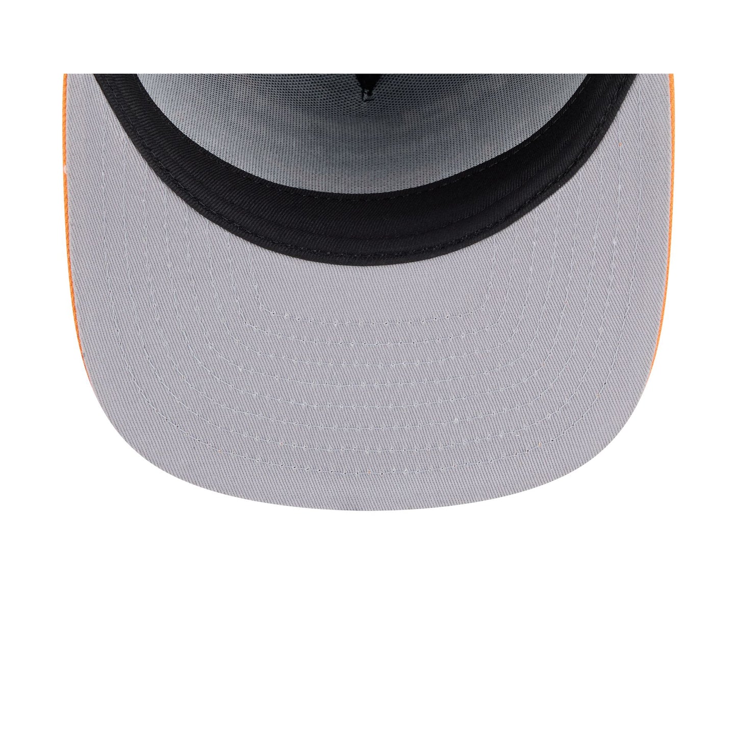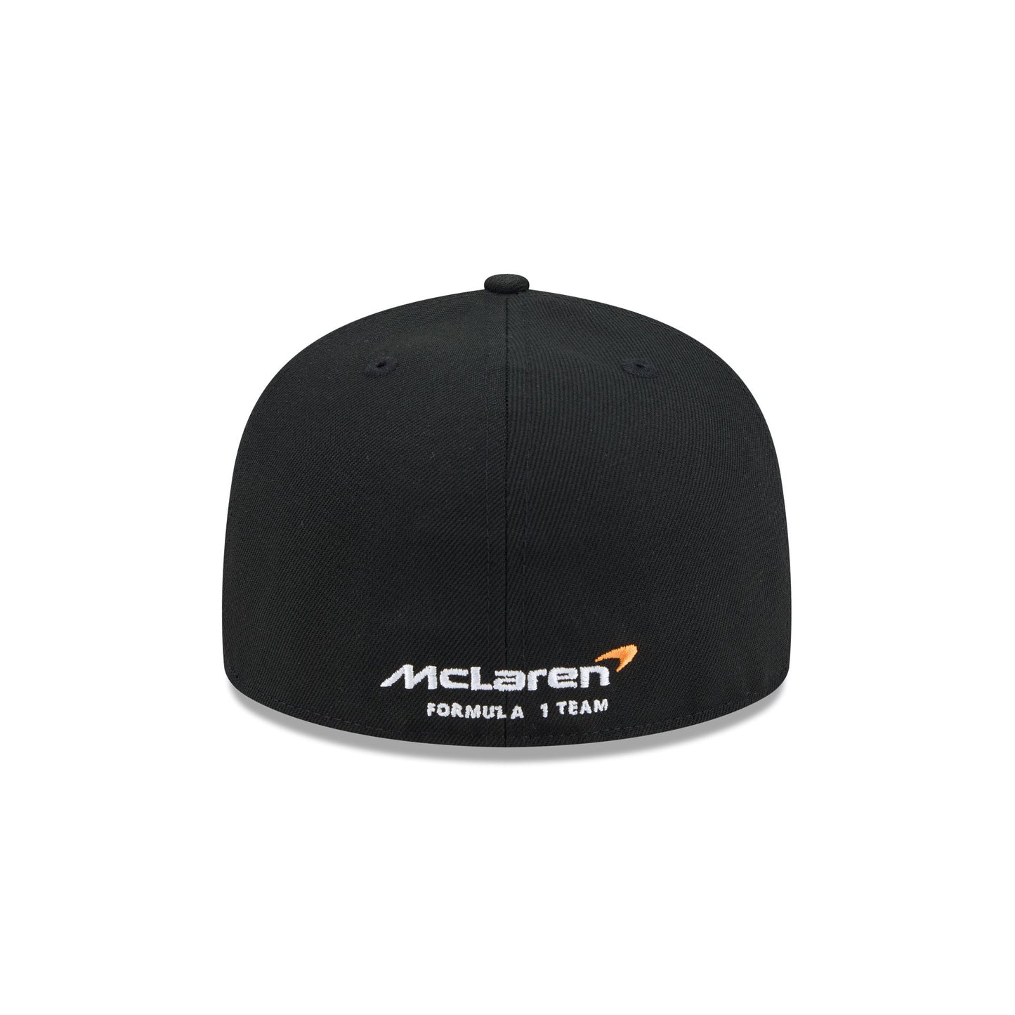 The McLaren Formula 1 Team Desert 59FIFTY A-Frame Fitted Cap features an embroidered McLaren Racing wordmark above a desert sunset graphic at the front panel. Additional details include a matching team wordmark at the rear with and orange visor and a gray undervisor.