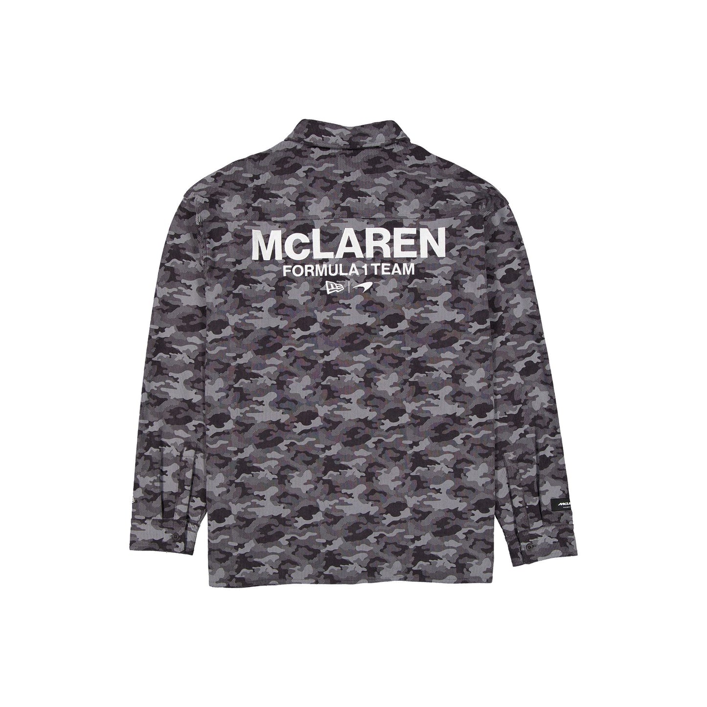 The McLaren Formula 1 Team Gray Camo Long Sleeve Shirt features an embroidered McLaren logo at the pocket with an embroidered satin stitch wordmark at the rear. Additional details include a button closure and a woven tag at the right arm.