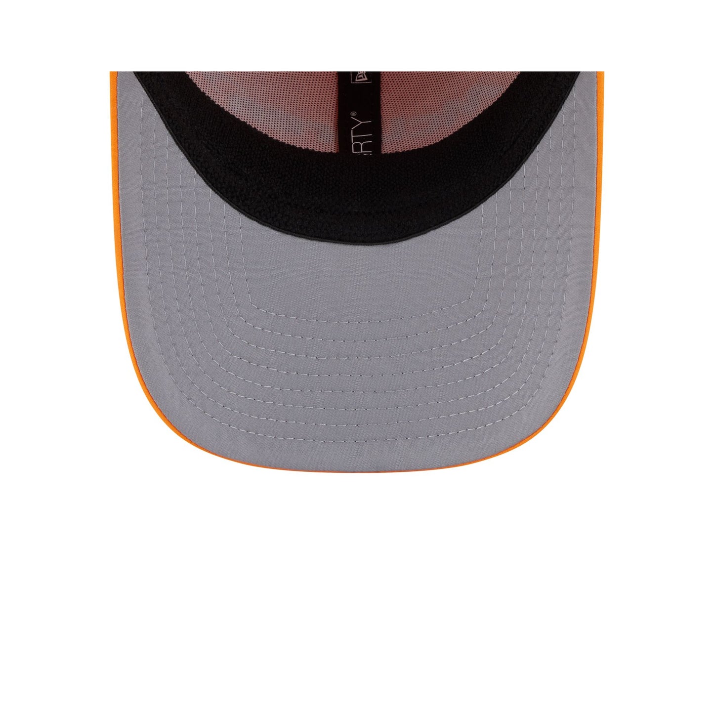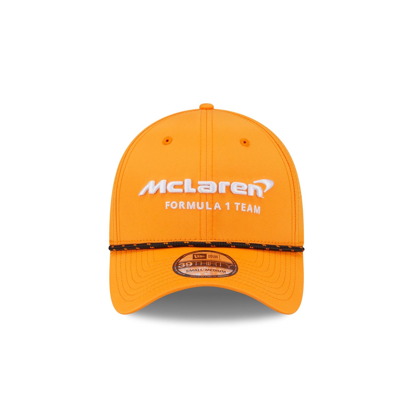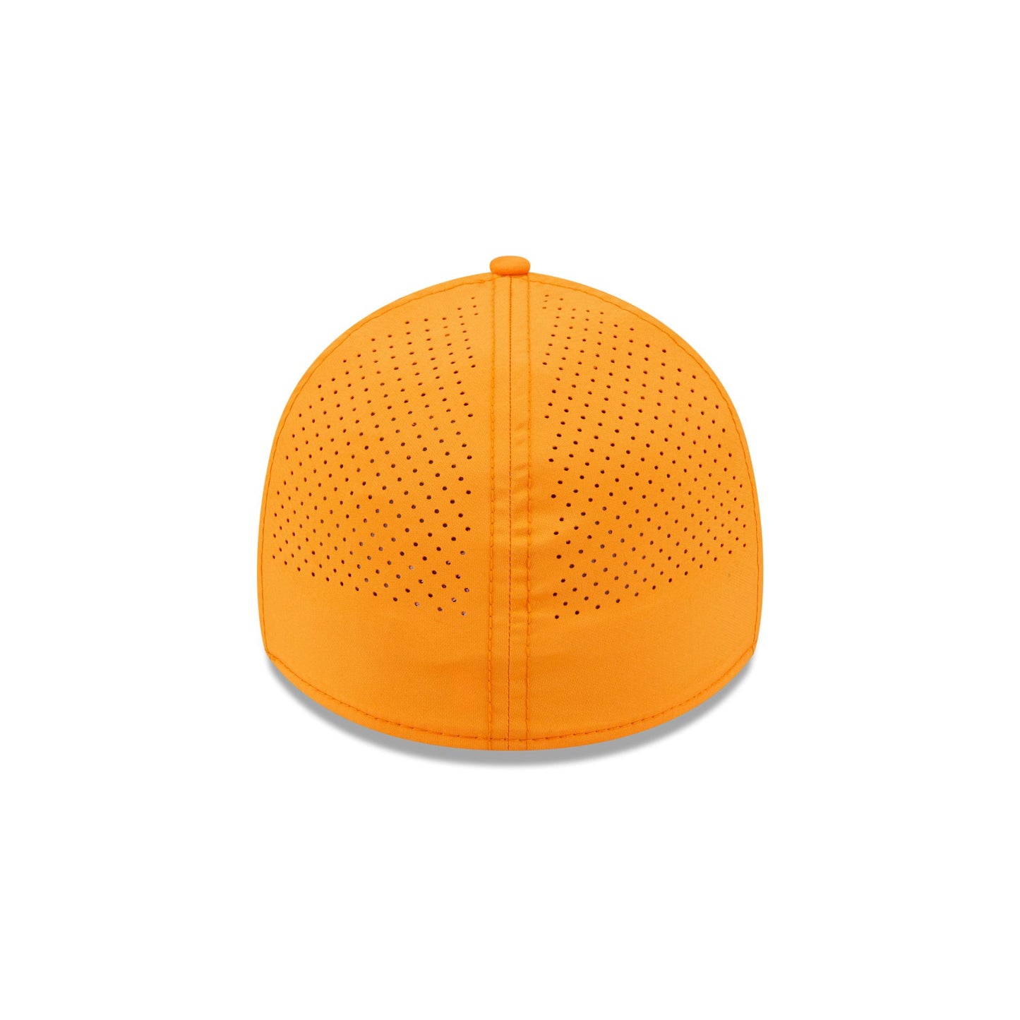 The McLaren Formula 1 Team Perform 39THIRTY Stretch-Fit Cap features an embroidered McLaren Racing logo at the front panels with a rope at the visor. Additional details include a performance mesh back with the driver's number at the rear and a gray undervisor.
