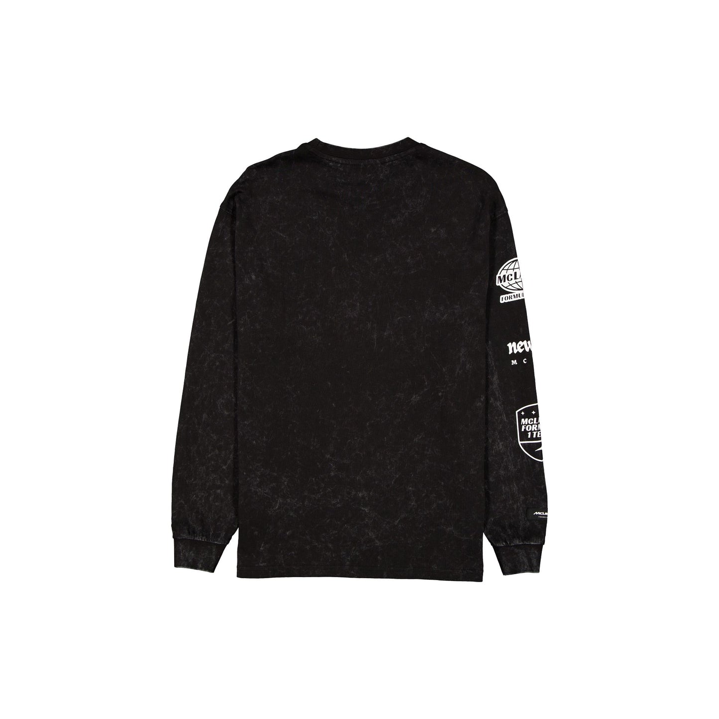 The McLaren Formula 1 Team Pigment Wash Black Long-Sleeve T-Shirt features a screen-printed McLaren wordmark at the front with a 1963 establishment date at the upper right chest and logo to the left. Additional details include New Era and McLaren logos down the right arm.