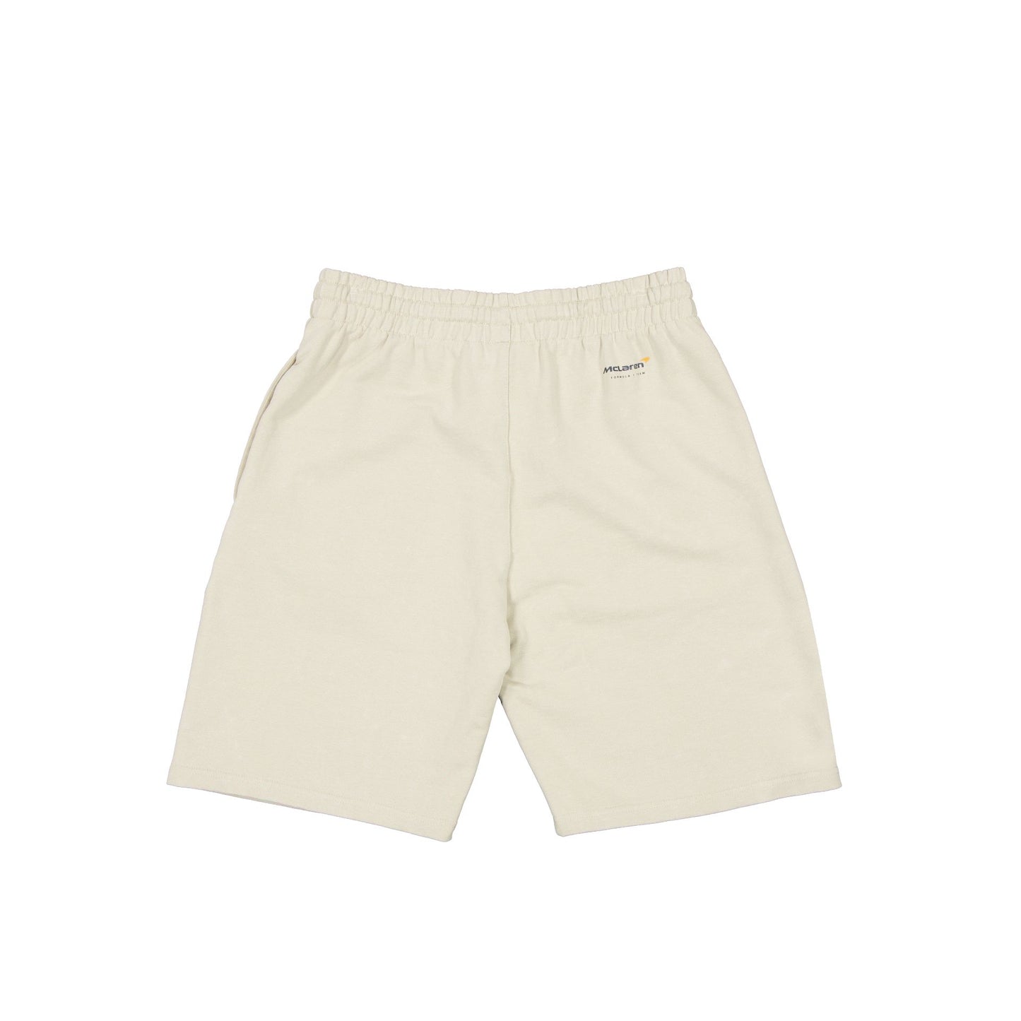 The McLaren Formula 1 Team Pigment Wash Stone Shorts feature a screen-printed McLaren wordmark at the right leg with pockets and adjustable drawstrings at the waist.