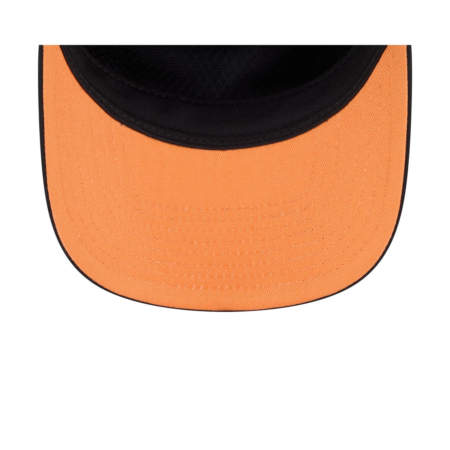 The McLaren Formula 1 Team Vegas 19TWENTY Snapback features an embroidered McLaren Racing wordmark with pink and orange stripes at the front panel. Additional details include card suit symbols and die at the right-wear side with a snapback closure at the rear and an orange undervisor.
