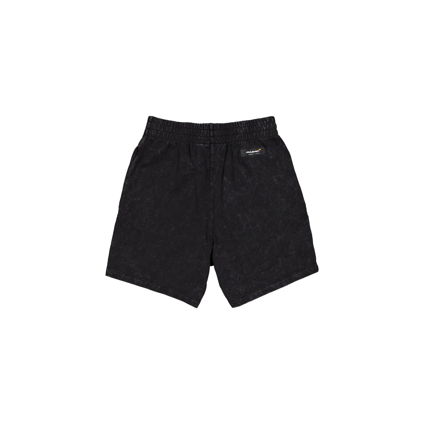 The McLaren Formula 1 Team Washed Black Shorts feature an embroidered McLaren applique wordmark at the right leg and embroidered logo at the left leg. Additional details include a woven patch at the rear, pockets, and adjustable drawstrings at the waistband.
