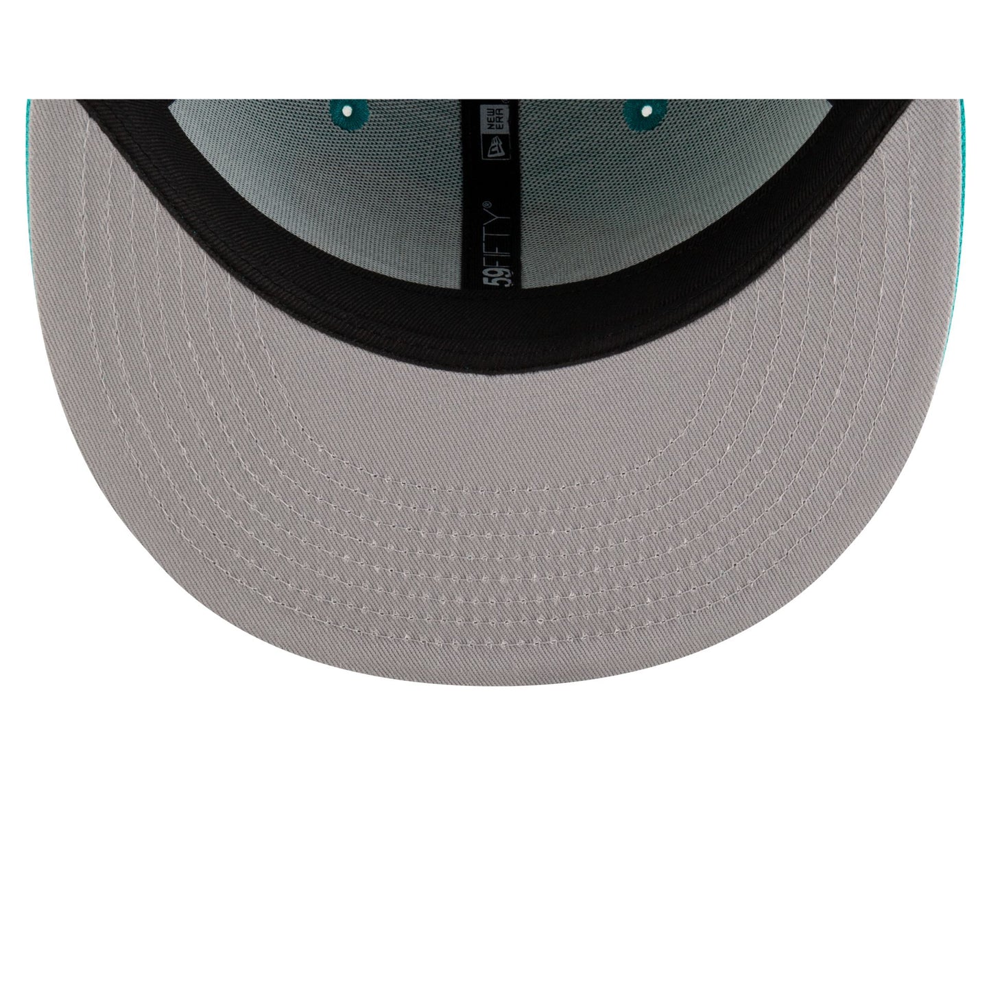 The Memphis Grizzlies Classic Edition Birdseye Blue 59FIFTY Fitted Cap features an embroidered Grizzlies logo at the front panels with a team logo at the right-wear side. Additional details include an NBA Logoman at the rear and a gray undervisor.