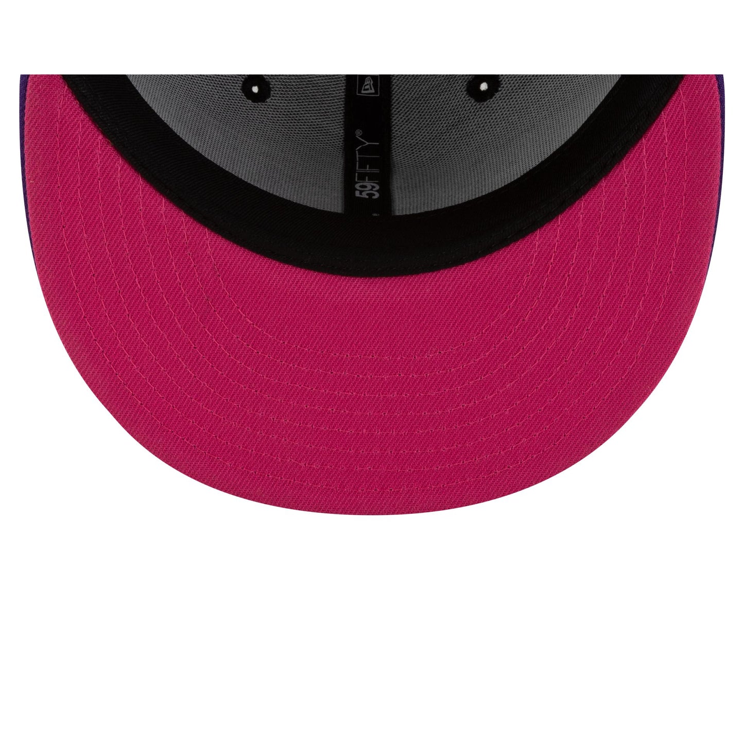 The Memphis Redbirds Black Food Pack 59FIFTY Fitted Cap features an embroidered Redbirds nacho themed logo at the front panels with a matching MiLB Batterman logo at the rear. Additional details include a BBQ Nachos team patch at the right-wear side with a purple visor and a pink undervisor.