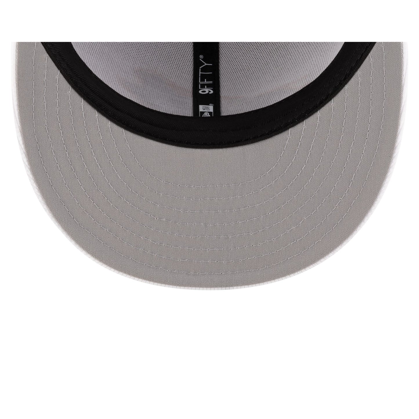 The Memphis Showboats White 9FIFTY Snapback features an embroidered Showboats logo at the front panels with the New Era Flag at the left. Additional details include a UFL logo above a snapback closure at the rear and a gray undervisor.