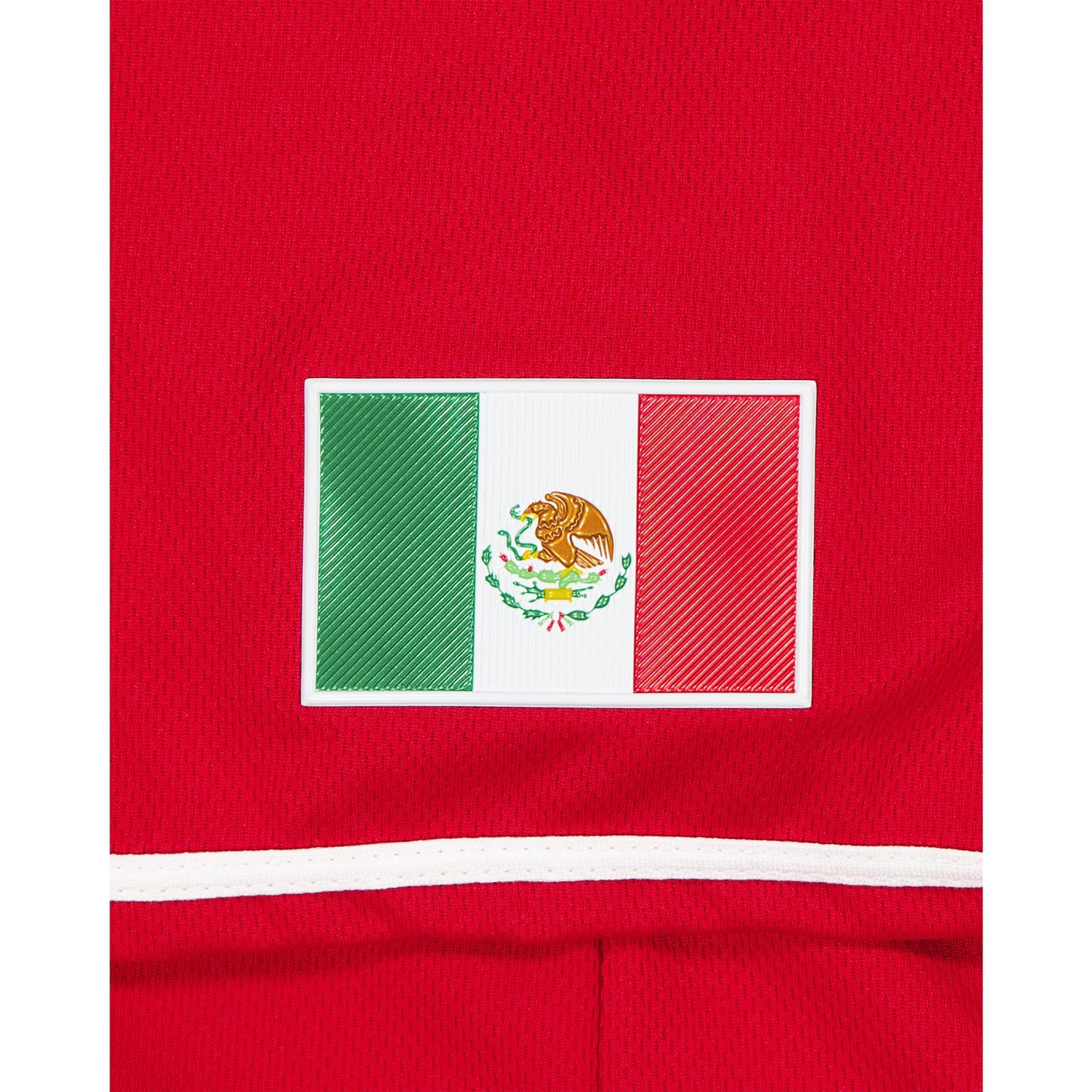 The Mexico Baseball Home Jersey features an embroidered applique Mexico Baseball wordmark at the chest with the Mexican flag at the right-wear sleeve.