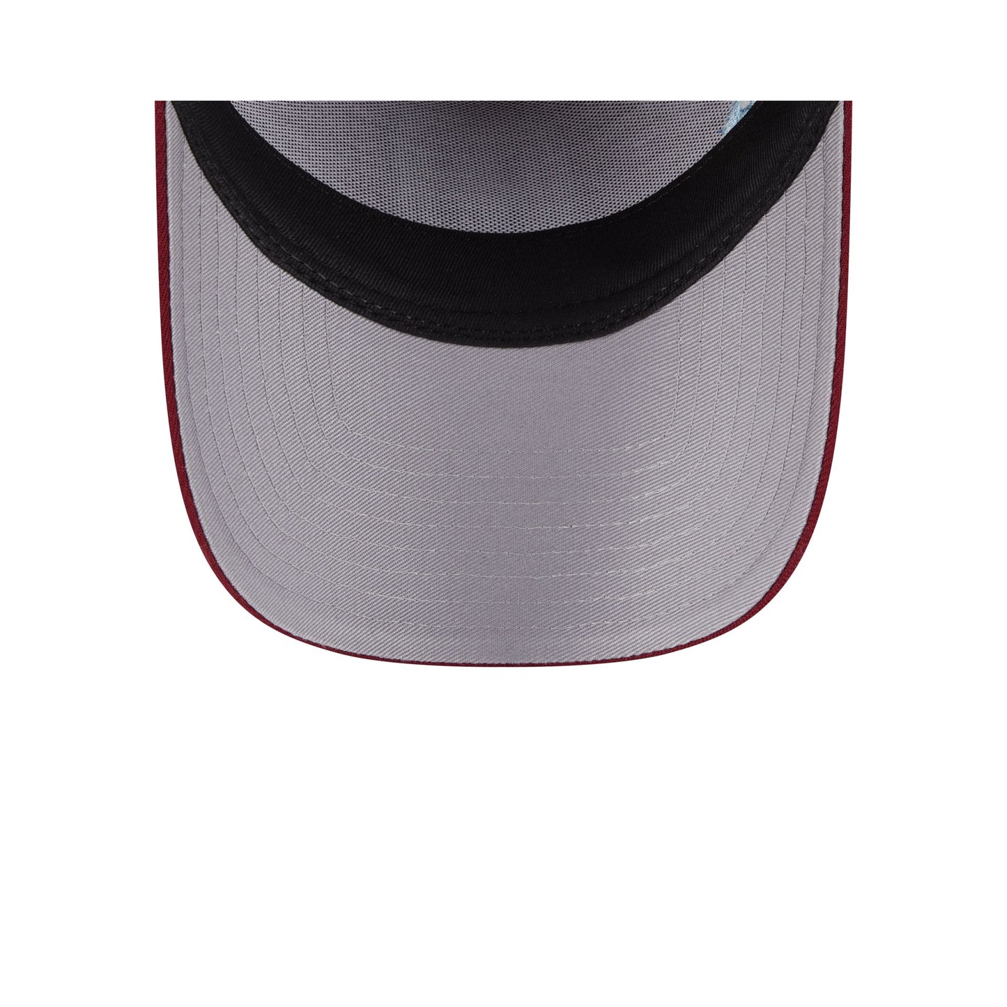 The Mexico Baseball New Era Anniversary Logos Maroon 9FORTY M-Crown A-Frame Snapback features an embroidered Mexico Baseball logo at the front panels with New Era Cap wordmark above a snapback closure at the rear. Additional details include New Era signature phrases and badges throughout the crown with a gray undervisor.