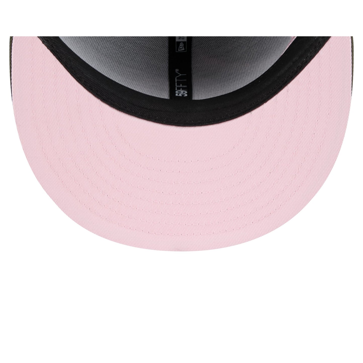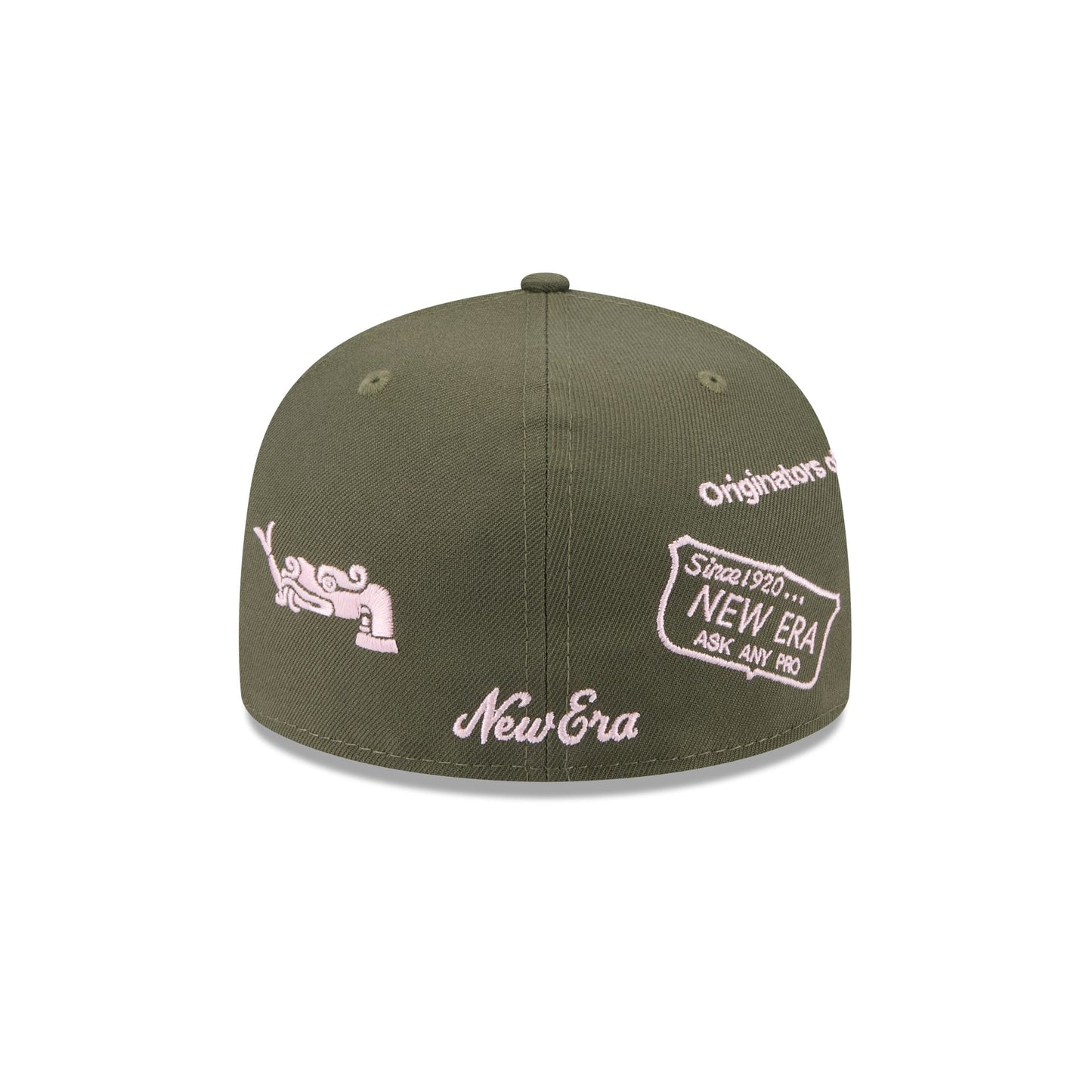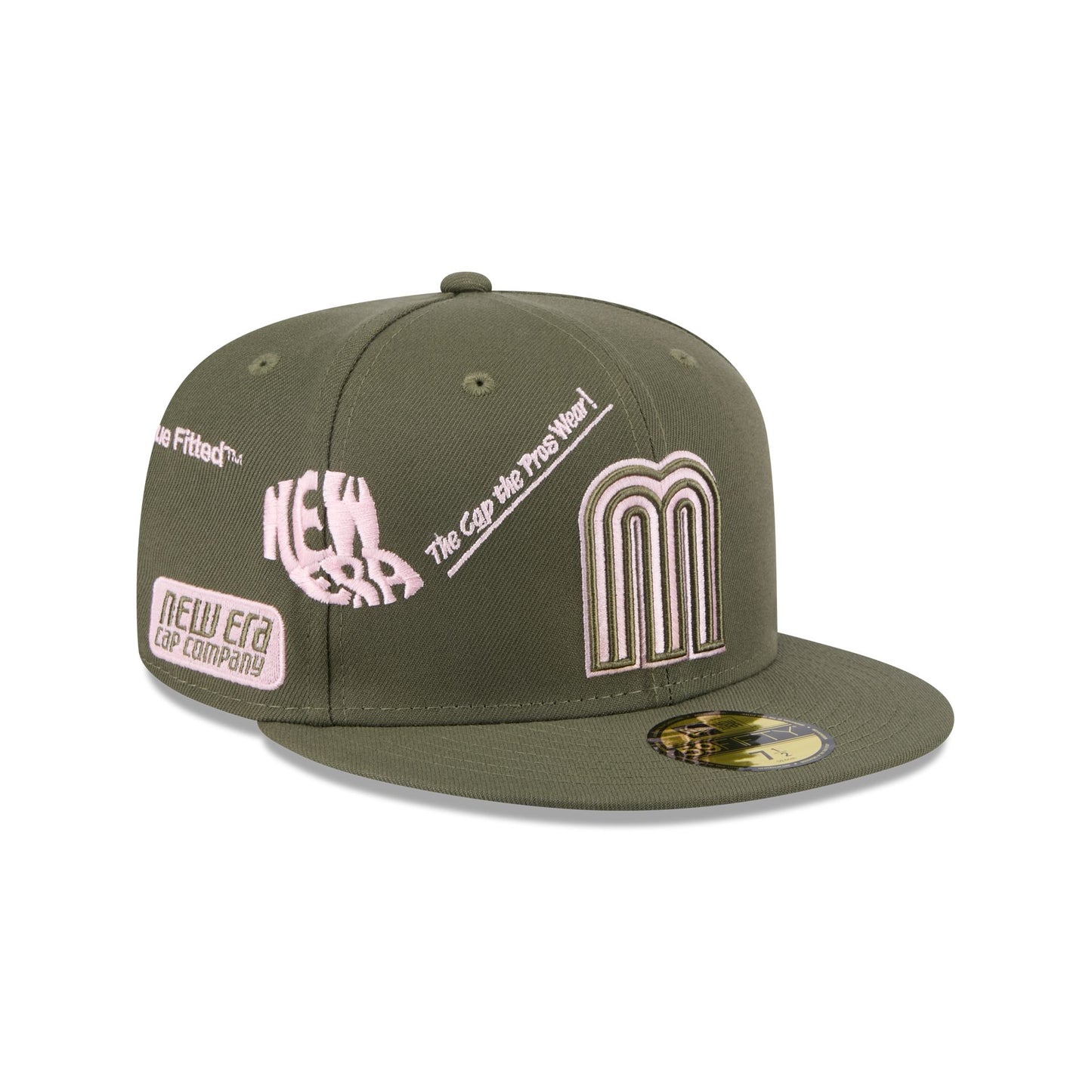 The Mexico Baseball New Era Anniversary Logos Olive 59FIFTY Fitted Cap features an embroidered Mexico Baseball logo at the front panels with New Era Cap wordmark at the rear, New Era signature phrases and badges throughout the crown, and a pink undervisor.
