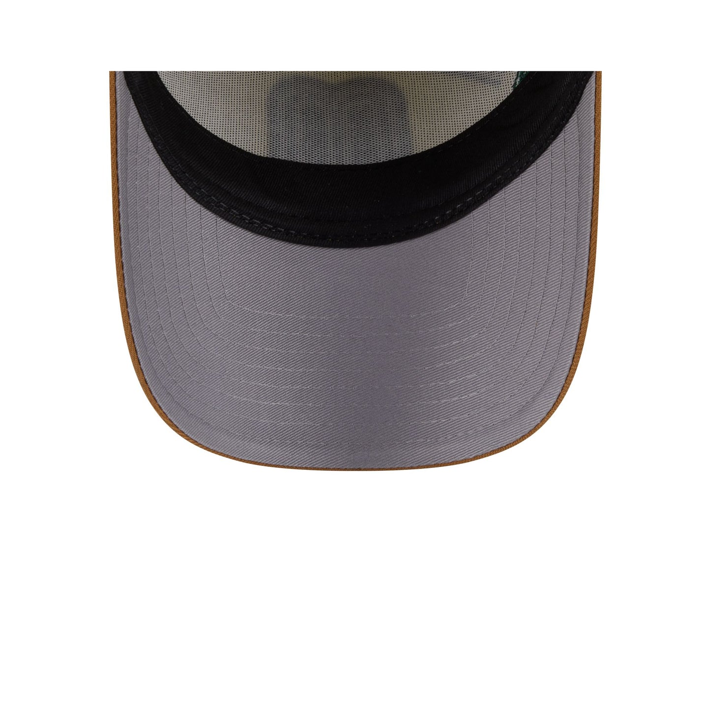 The Mexico Baseball New Era Anniversary Logos Tan Visor 9FORTY M-Crown A-Frame Snapback features an embroidered Mexico Baseball logo at the front panels with New Era Cap wordmark above a snapback closure at the rear. Additional details include New Era signature phrases and badges throughout the crown with a tan visor and a gray undervisor.