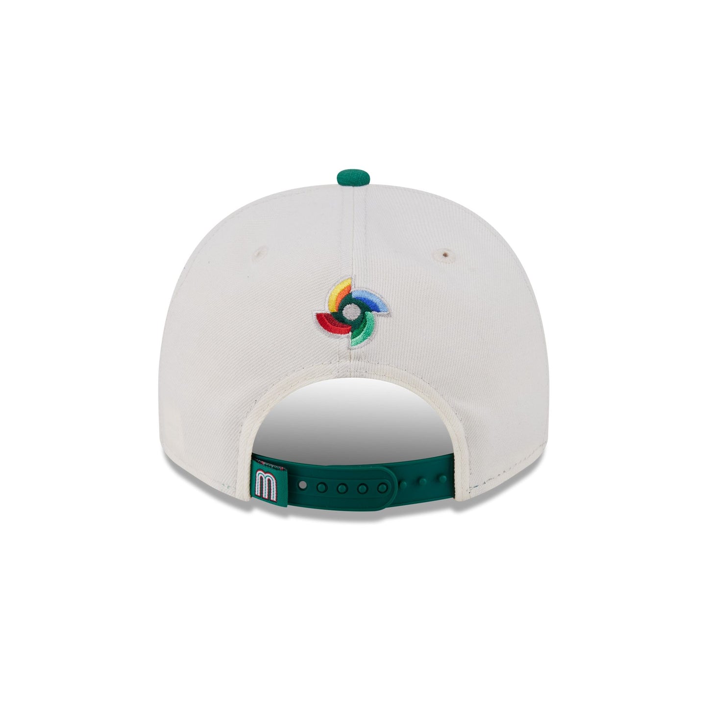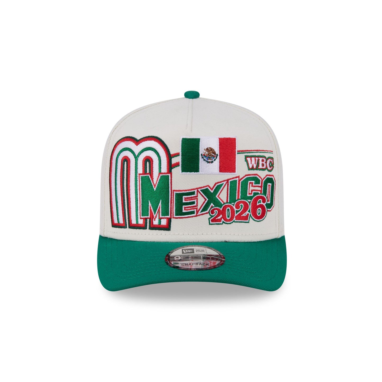 The Mexico Chrome White Classic 9FIFTY A-Frame Snapback features an embroidered Mexico graphic at the front panels with a World Baseball Classic logo above an adjustable snapback closure at the rear and a green undervisor.