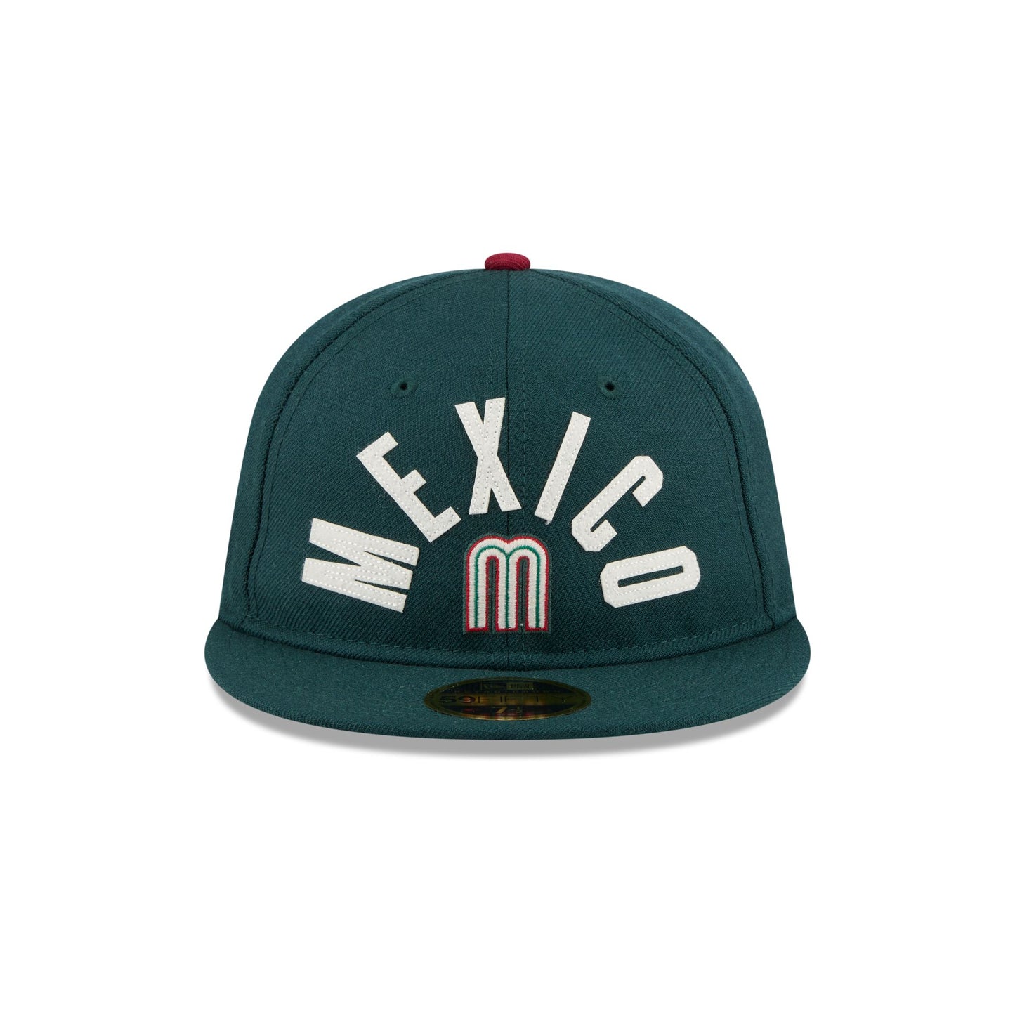 The Mexico Classic Script Retro Crown 59FIFTY Fitted Cap features a felt applique Mexico wordmark above an embroidered team logo at the front panels with a World Baseball Classic logo at the rear. Additional details include a matching team flag at the right-wear side with a green undervisor.