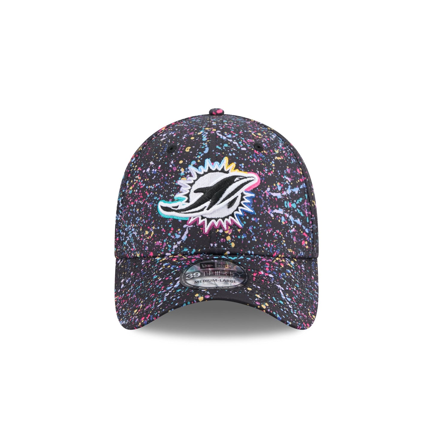The Miami Dolphins 2025 Crucial Catch 39THIRTY Stretch Fit Cap features an embroidered Dolphins logo at the front paint splatter panels with an NFL Shield at the rear, a Crucial Catch Intercept Cancer patch at the right-wear side, and a black undervisor.