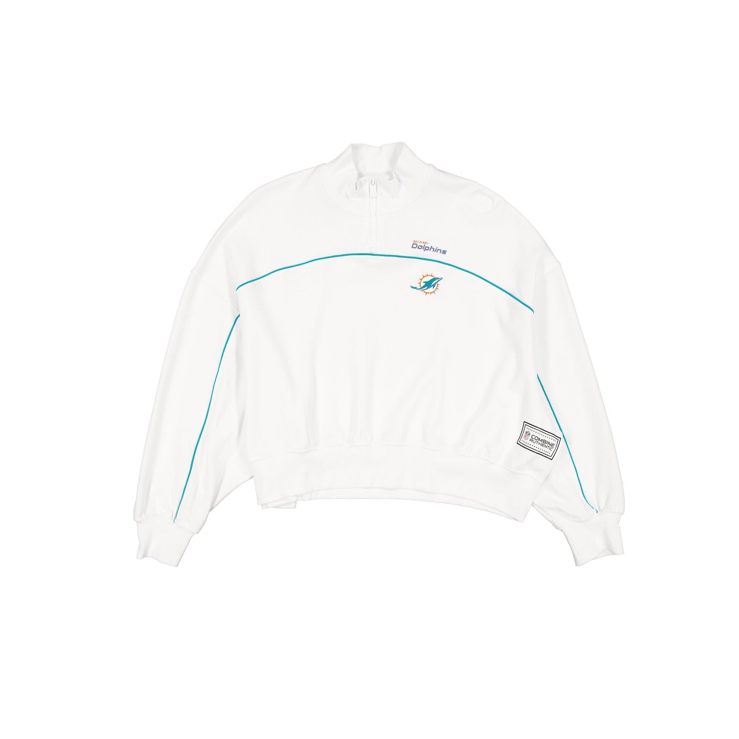 The Miami Dolphins 2025 Functional Fandom Women's Quarter Zip features a silicone print Dolphins logos at the left chest with an Official NFL Combine Authentic patch at the left hip. Additional details include moisture-wicking and antimicrobial fabric with UV protection.