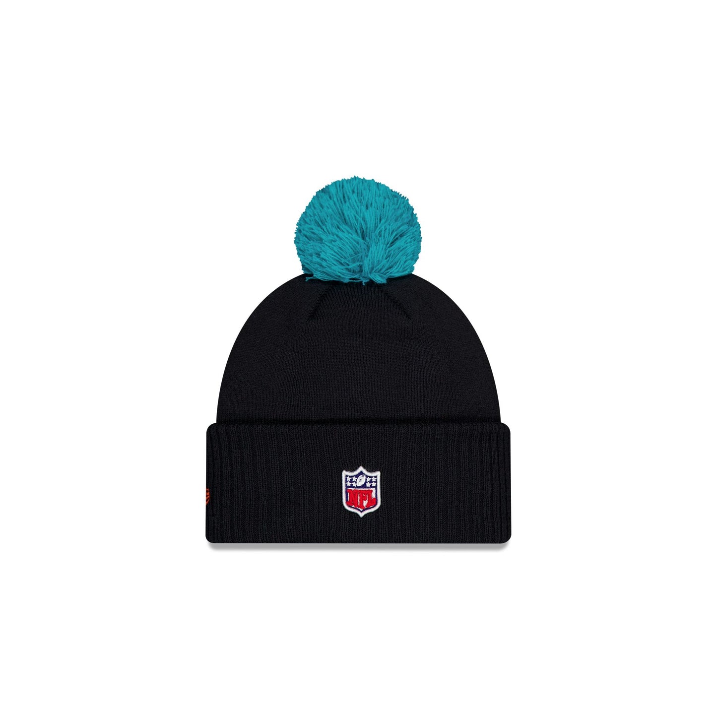 Represent the dark waters with deep hues and iridescent elements. The Miami Dolphins 2025 NFL Rivalries Kids Pom Knit features an embroidered Dolphins Rivalries logo at the front cuff with the NFL Shield logo at the rear and a one-time removable pom.