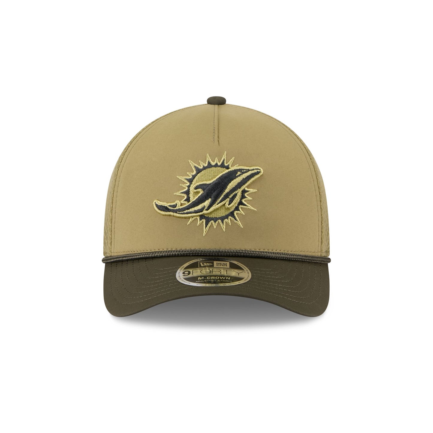 The Miami Dolphins 2025 Salute to Service 9FORTY M-Crown A-Frame Trucker features an embroidered Dolphins logo at the front panel with the official NFL Salute to Service patch above a snapback closure at the rear. Additional details include an American flag patch at the right-wear side with a silicone team logo patch at a dark green undervisor and a digi camo interior fabrication.