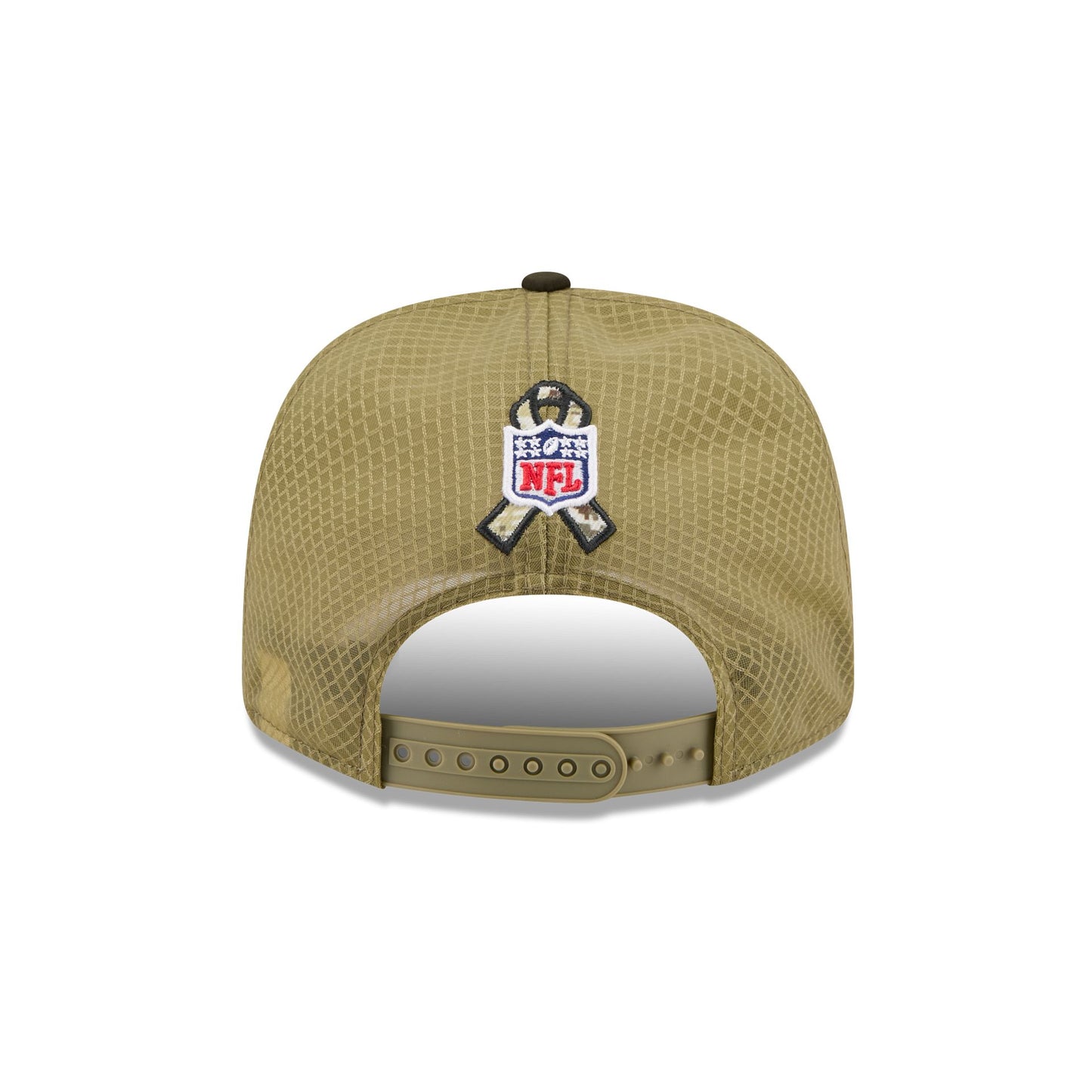 The Miami Dolphins 2025 Salute to Service 9SEVENTY Trucker features an embroidered Dolphins logo at the front panels with the official NFL Salute to Service patch above a snapback closure at the rear. Additional details include an American flag patch at the right-wear side with a silicone team logo patch at a dark green undervisor and a digi camo interior fabrication.