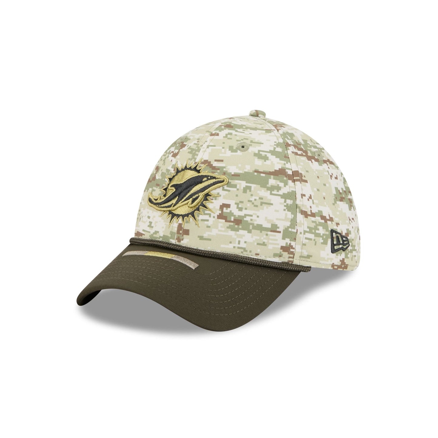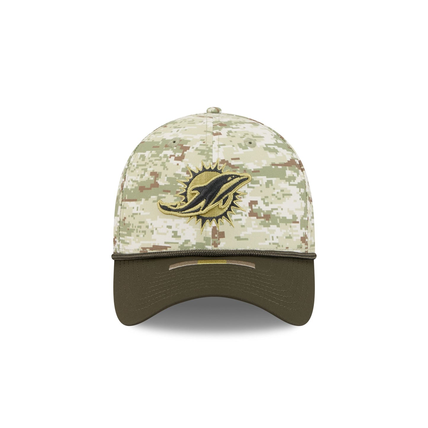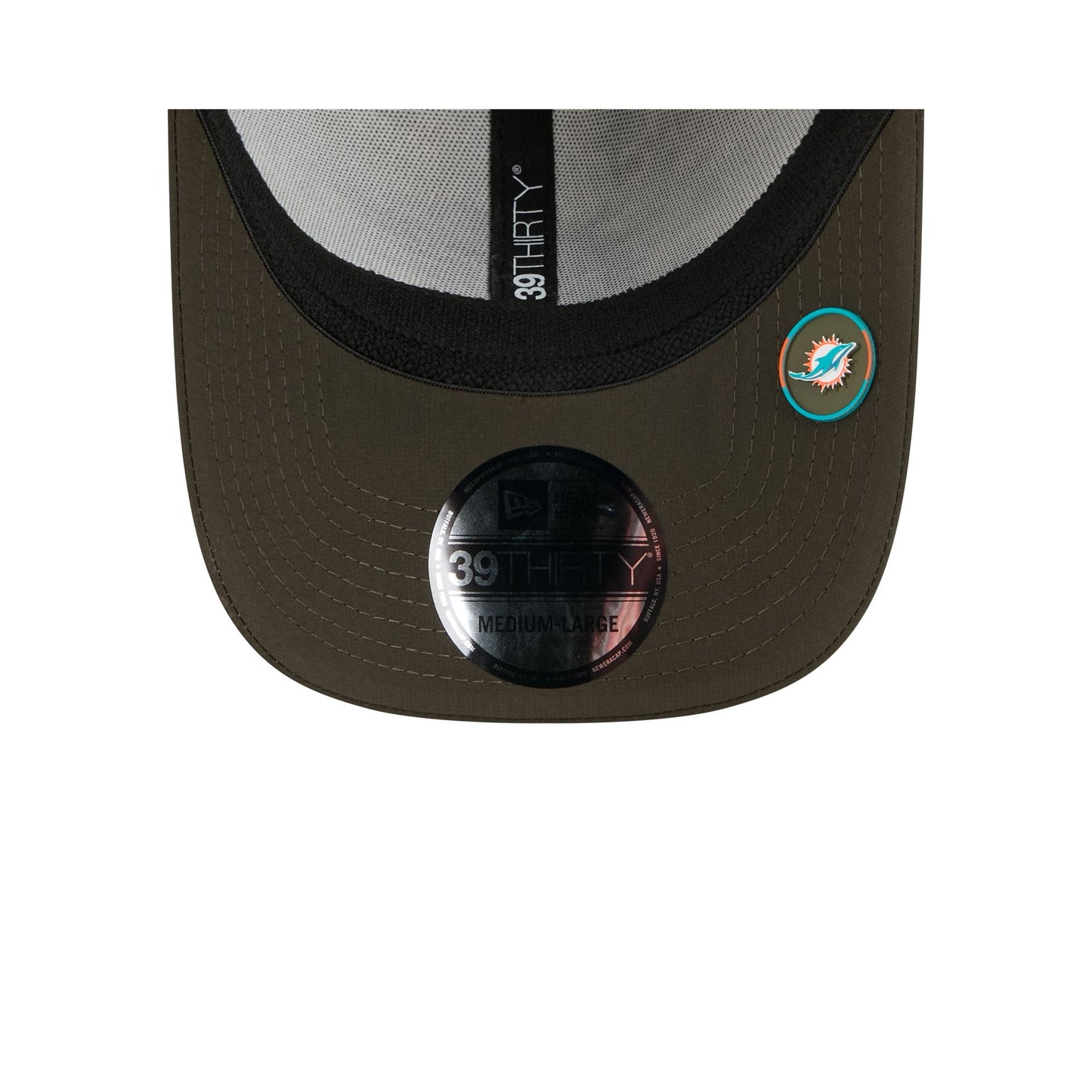 The Miami Dolphins 2025 Salute to Service Digi Camo 39THIRTY Stretch Fit Cap features an embroidered Dolphins logo at the front panels with the official NFL Salute to Service patch at the rear and American flag patch at the right-wear side. Additional details include three green stripes at the visor and a silicone team logo patch at a dark green undervisor..
