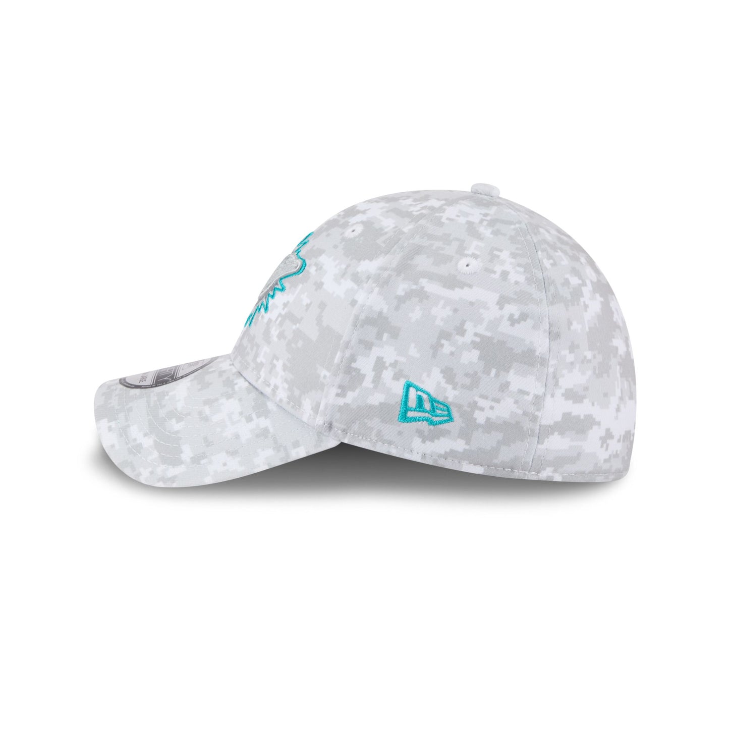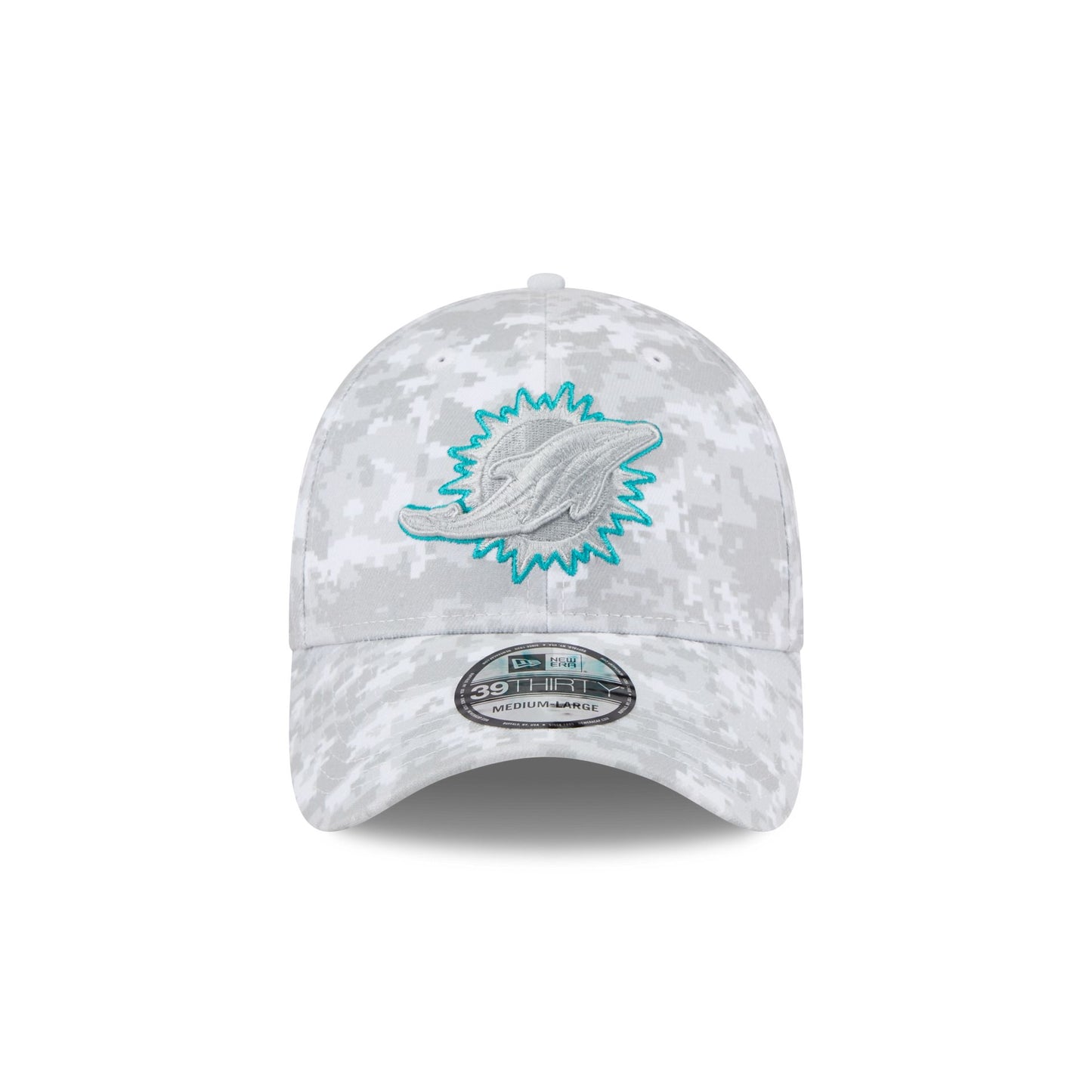 The Miami Dolphins 2025 Salute to Service Fan Gear 39THIRTY Stretch Fit Cap features an embroidered Dolphins logo at the front panels with the official NFL Salute to Service patch at the rear, an American flag patch at the right-wear side, and a team color undervisor.