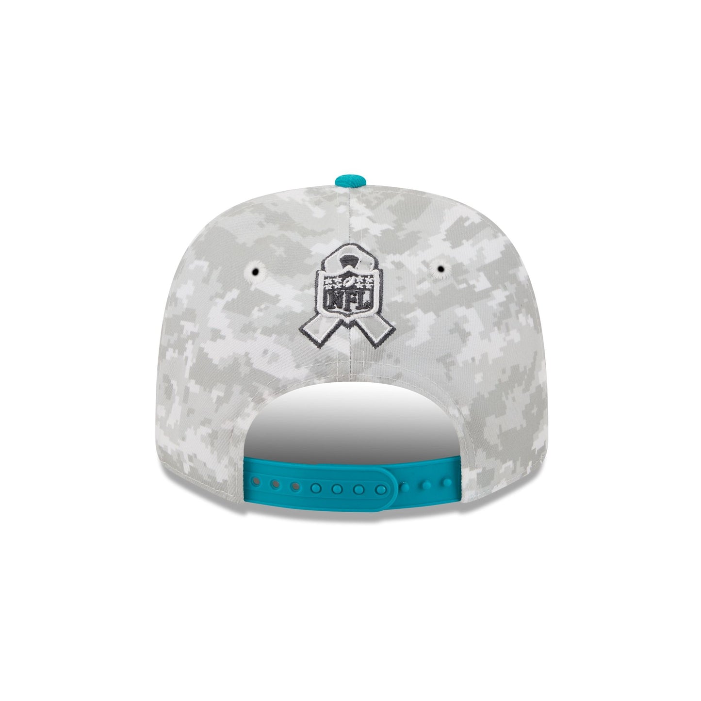 The Miami Dolphins 2025 Salute to Service Fan Gear 9SEVENTY Stretch-Snap Cap features an embroidered Dolphins logo at the front panels with the official NFL Salute to Service patch above a snapback closure at the rear, an American flag patch at the right-wear side, and a team color visor.