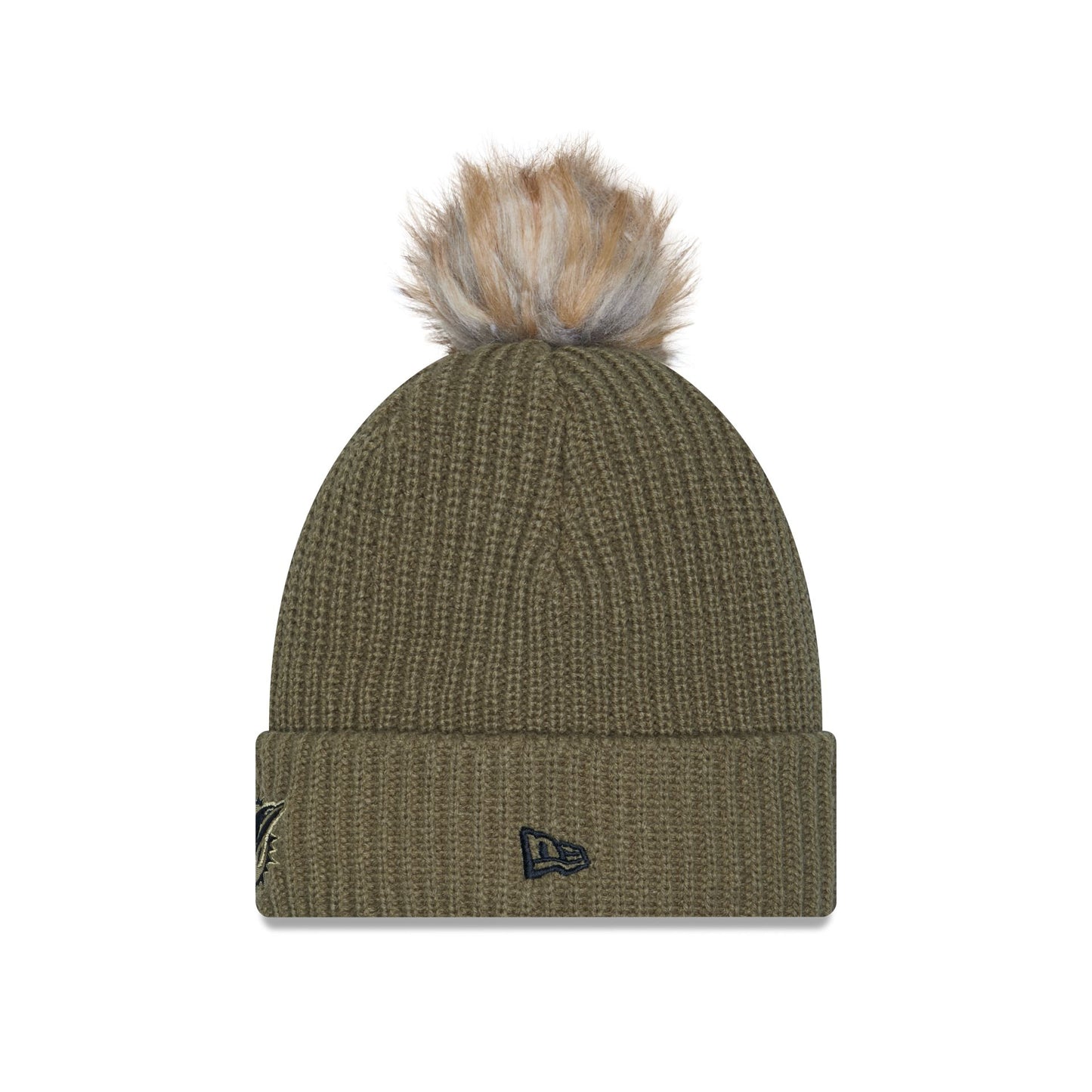 The Miami Dolphins 2025 Salute to Service Women's Pom Knit features an embroidered Dolphins logo at the front with an American flag patch at the right-wear side, the official NFL Salute to Service patch at the rear, and a one-time removeable pom.