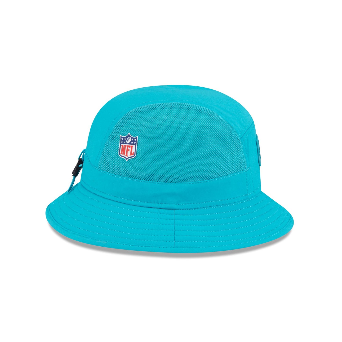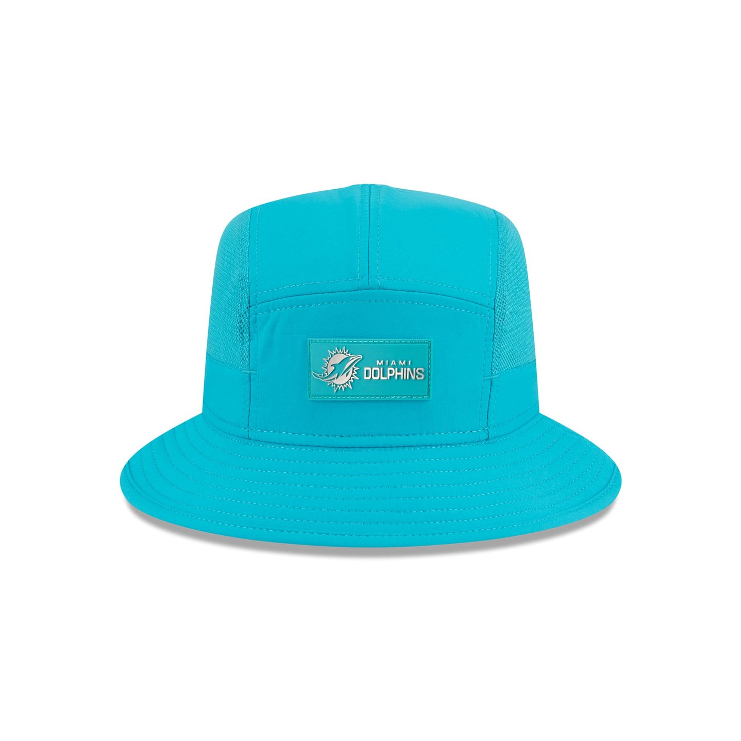 The Miami Dolphins 2025 Sideline Hot Weather Bucket Hat features a sewn-down silicone Dolphins logo patch at the front with the Official NFL Shield logo at the right-wear side. Additional details include breathable mesh side panels and an adjustable reflective drawstring at the rear.