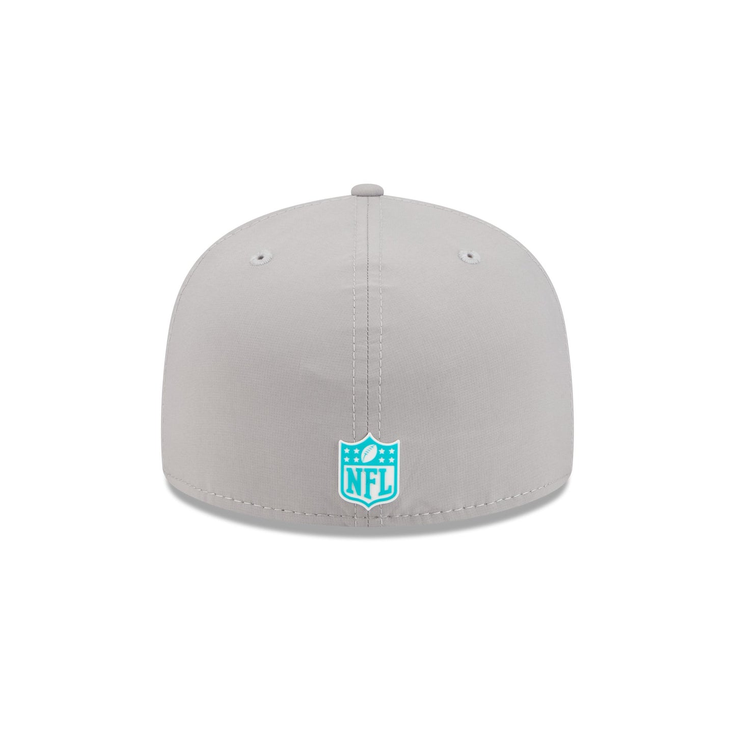 The Miami Dolphins 2025 Sideline Hot Weather Gray 59FIFTY Fitted Cap features a sewn-down silicone Dolphins logo patch at the front panels with a matching Official NFL Shield logo at the rear. The cap has a water-repellent quill tech fabrication throughout, with a quick-dry cushioned sweatband to absorb moisture. The undervisor is accented with a silicone transfer in the team’s colors.