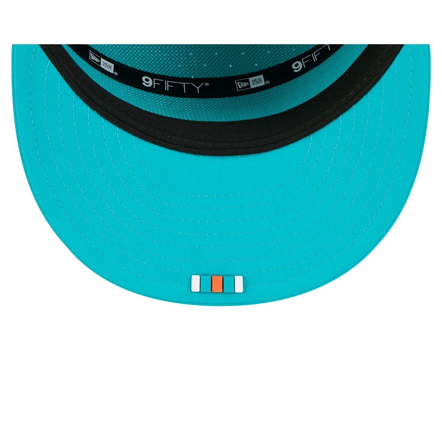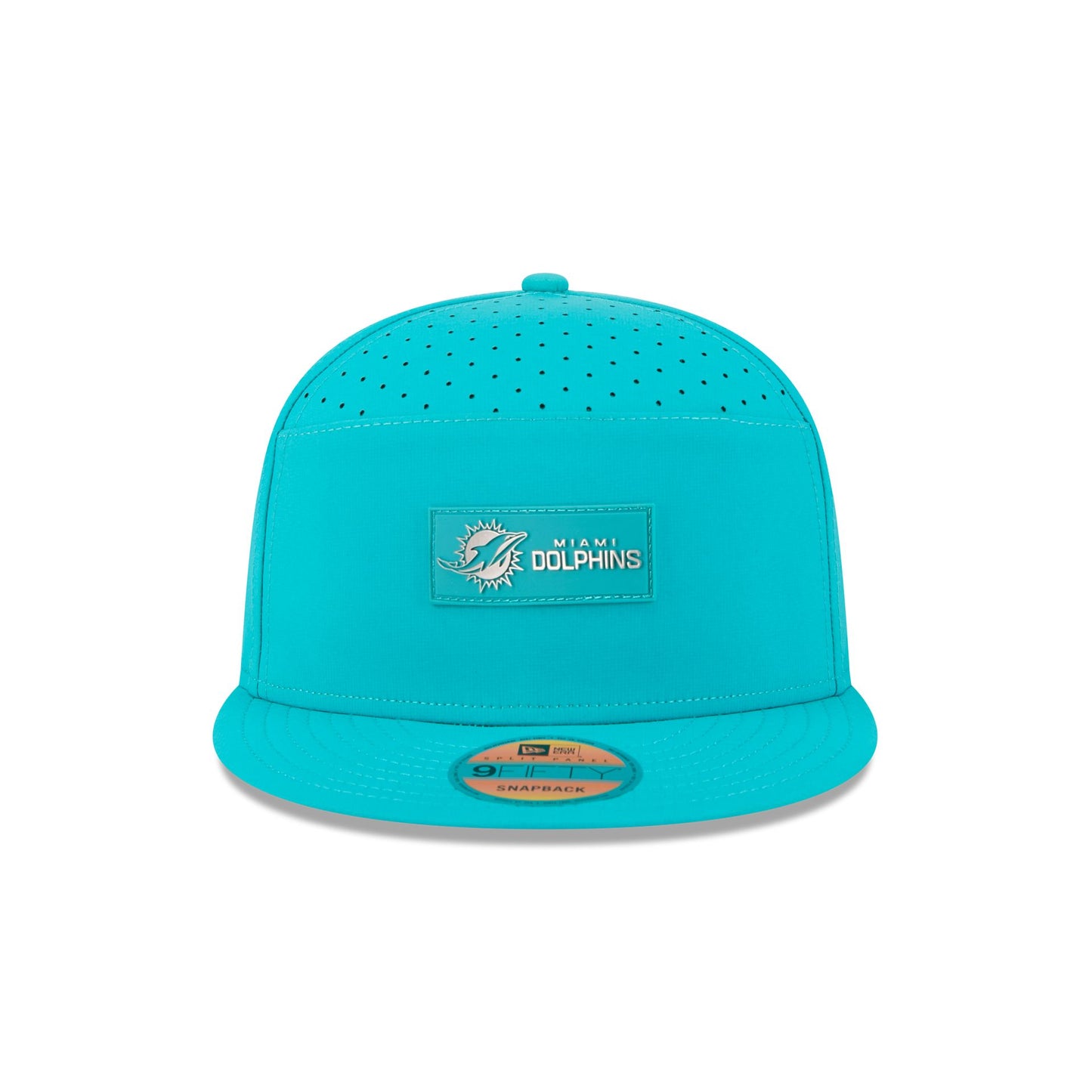 The Miami Dolphins 2025 Sideline Hot Weather Split Panel 9FIFTY Snapback features a sewn-down silicone Dolphins logo patch at the front panels with a split-crown construction. The cap has a water-repellent quill tech fabrication throughout, with a quick-dry cushioned sweatband to absorb moisture. Additional details include the Official NFL Shield logo to the right of a soft silicone snapback closure at the rear. The undervisor is accented with a silicone transfer in the team’s colors.