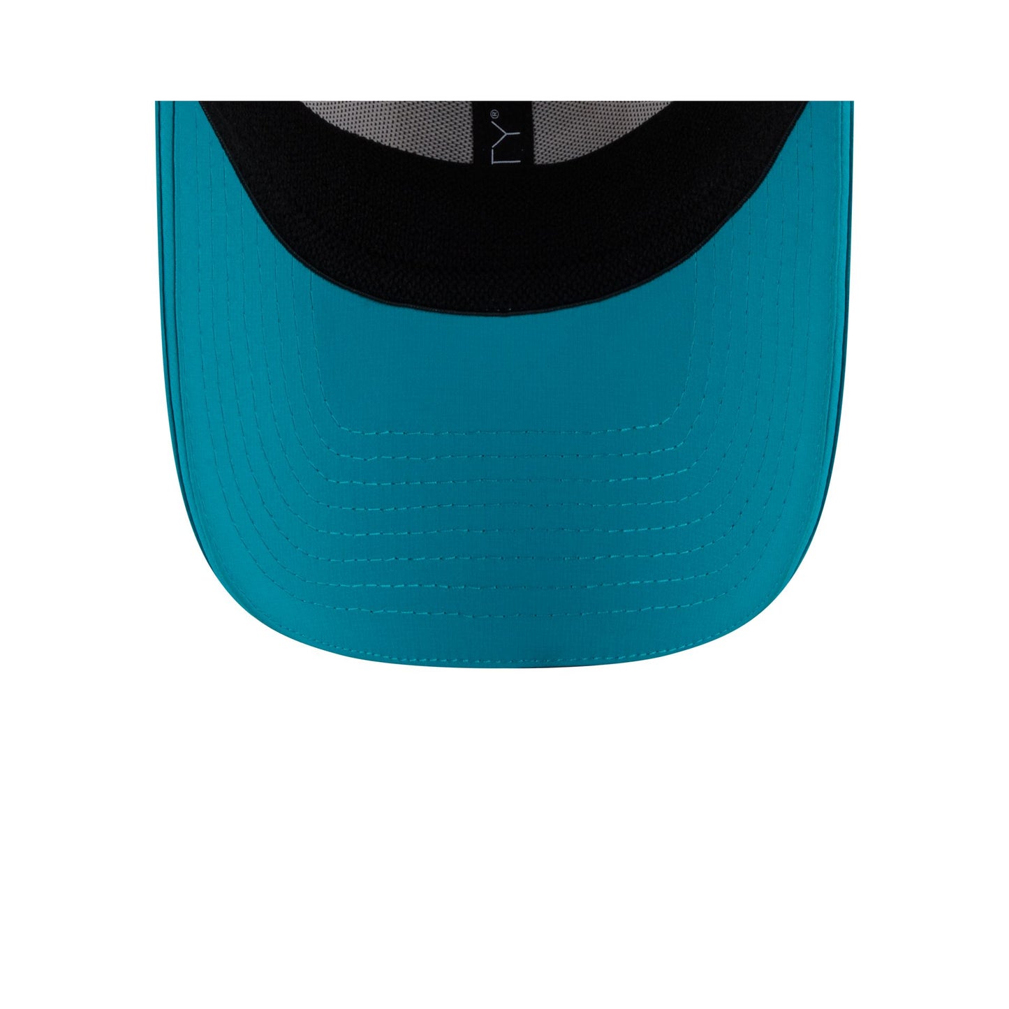 The Miami Dolphins 2025 Training 39THIRTY Stretch Fit Cap features a silicone Dolphins patch at the front panels with team color stripes at the front of a teal visor and a silicone NFL Shield patch at the rear.