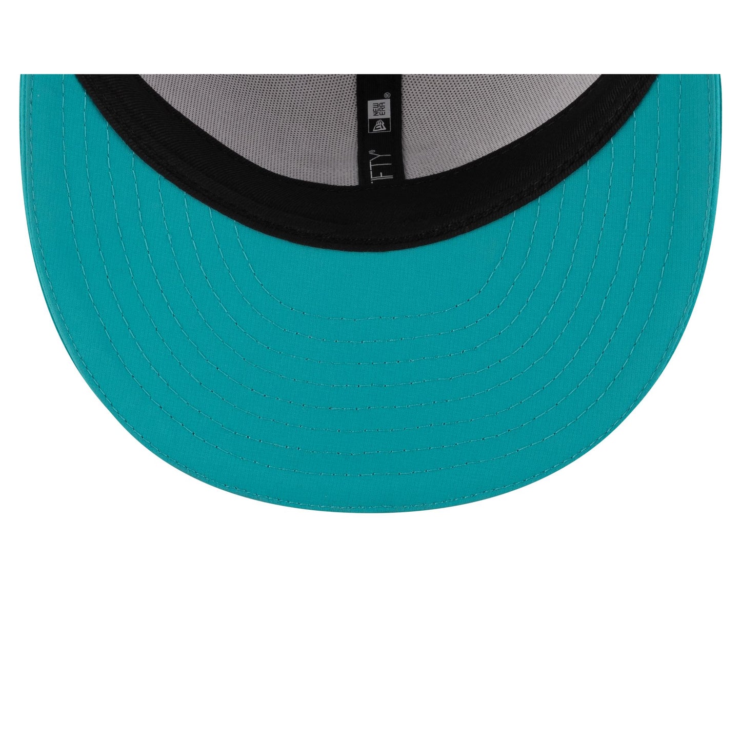 The Miami Dolphins 2025 Training 59FIFTY Fitted Cap features a silicone Dolphins patch at the front panels with team color stripes at the front of a teal visor and a silicone NFL Shield patch at the rear.