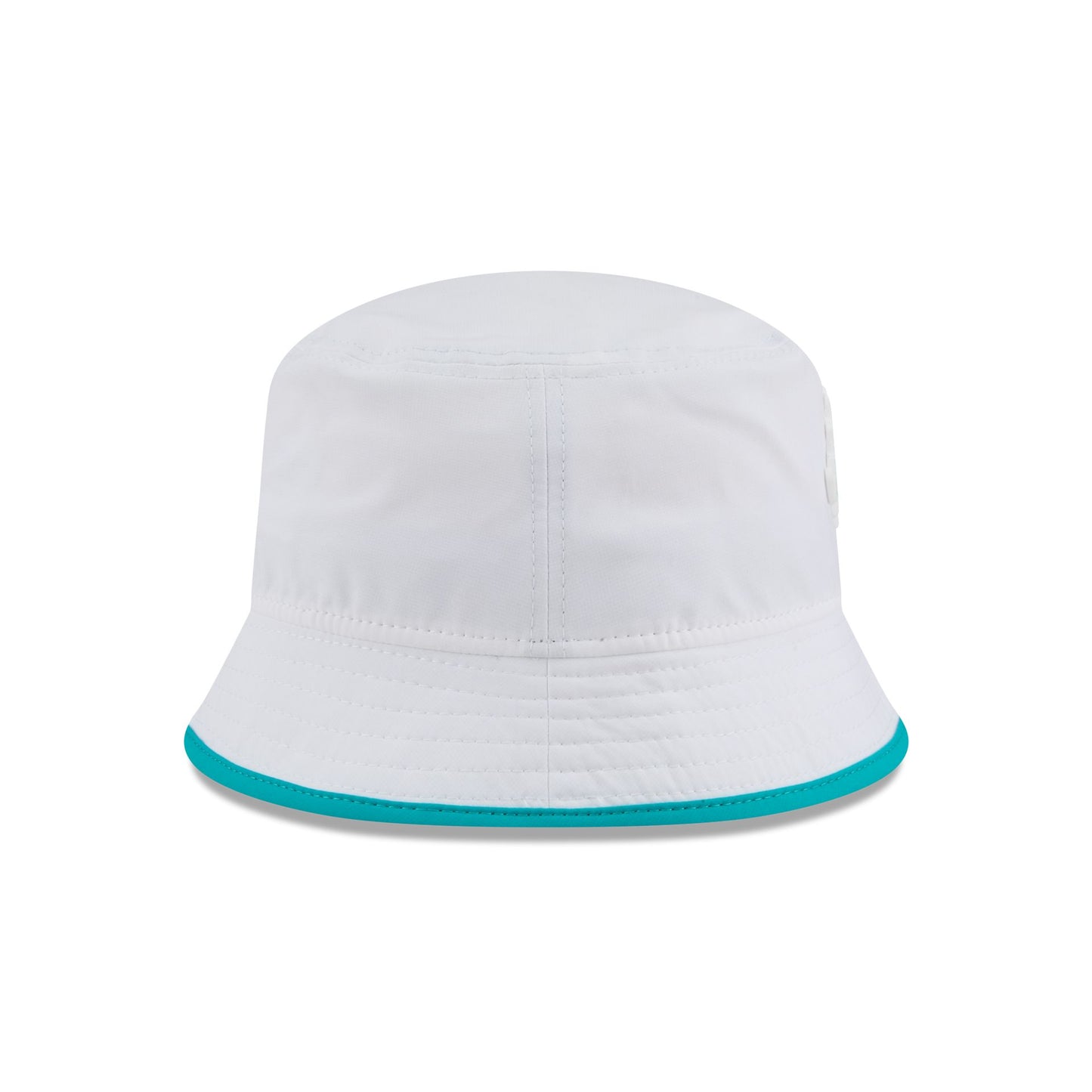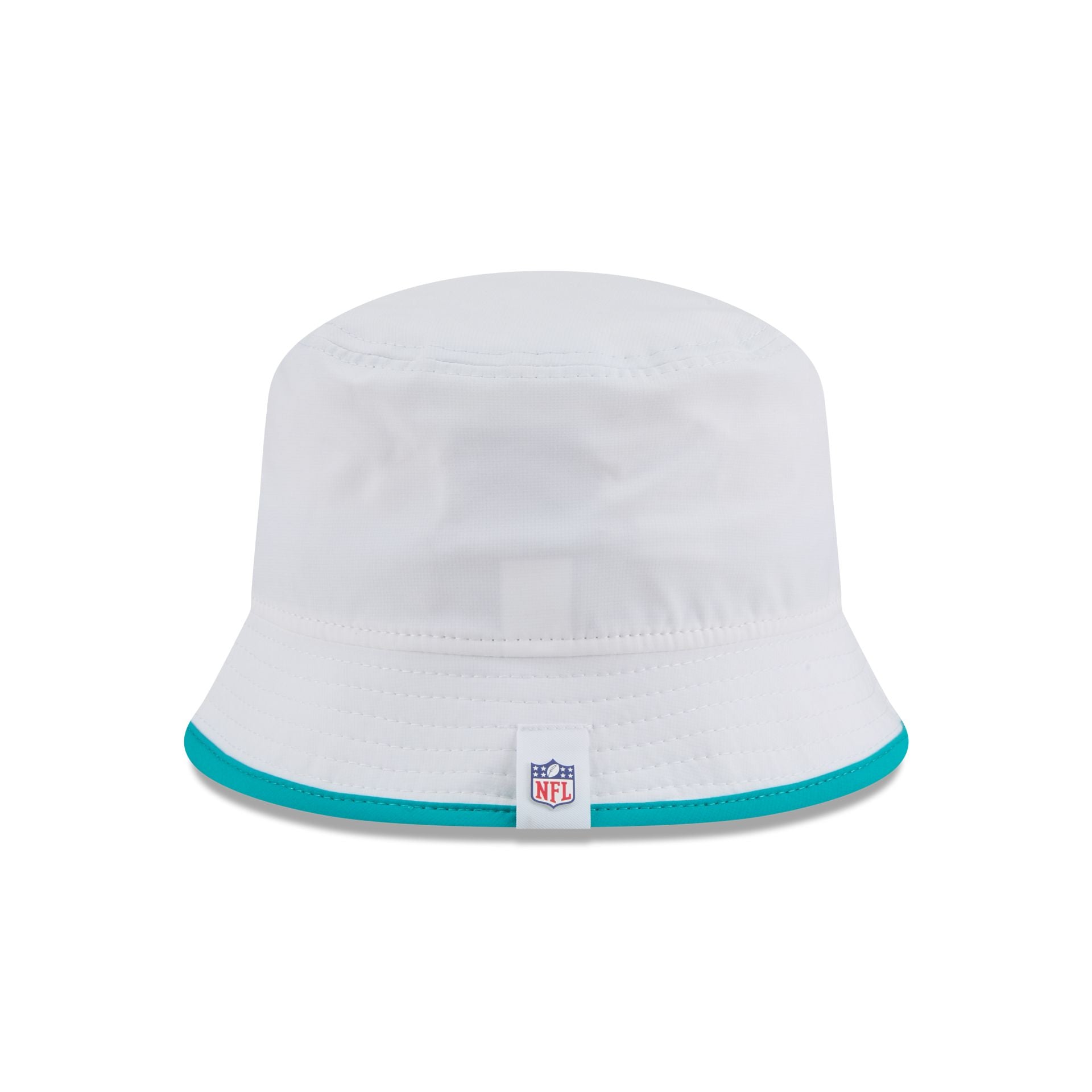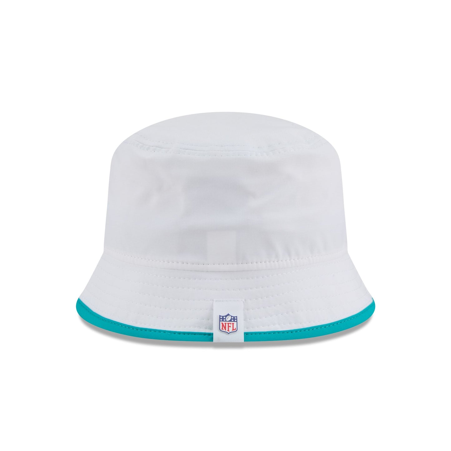 The Miami Dolphins 2025 Training Bucket Hat features a silicone Dolphins patch at the front panel with team color piping along the edge and a silicone NFL Shield patch on a woven foldover tab at the rear.