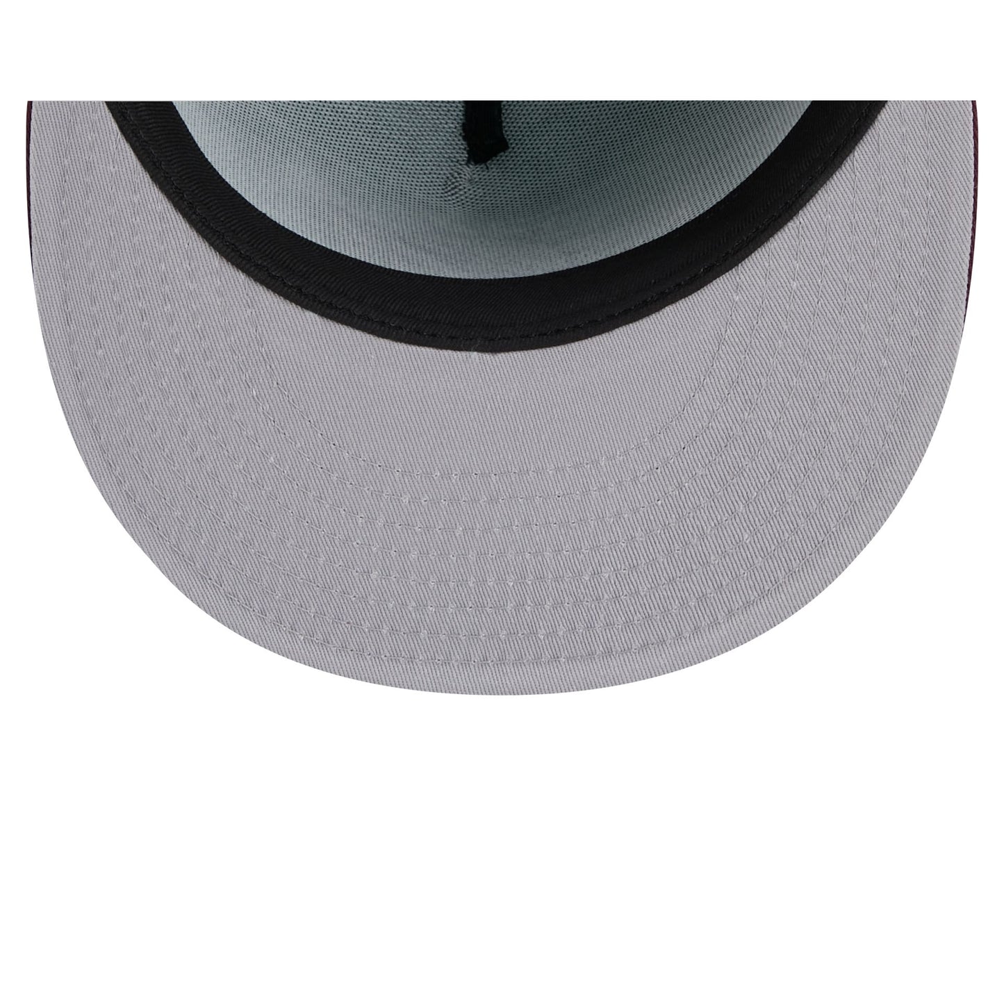 The Miami Dolphins Beach Kiss Blue 59FIFTY A-Frame Fitted Cap features an embroidered Dolphins logo at the front panels with a matching NFL Shield at the rear. Additional details include a 25th Anniversary patch at the right-wear side and a gray undervisor.
